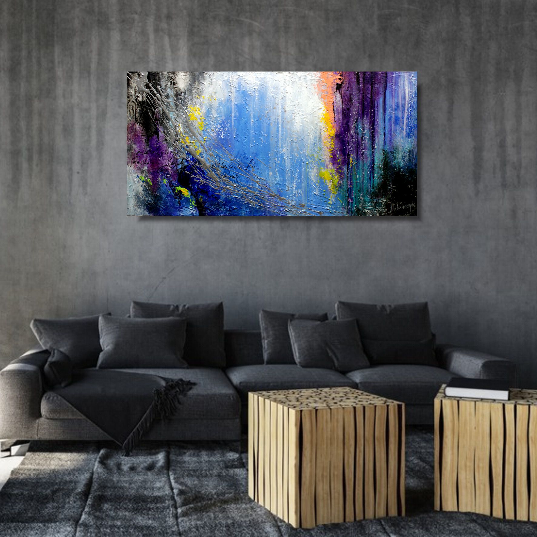 Abstrakcja duży niebieski obraz na płótnie “Płacząca wierzba” 1524A – zanurz się w nieprzewidywalnym tańcu kształtów i linii, odkryj piękno ukryte w abstrakcyjnej formie niedopowiedzianego przesłania. Abstrakcyjne formy, które tworzą tu wrażenie smutku i opuszczenia wydają się płynąć w dół, tworząc efekt płaczącej wierzby. Płacząca wierzba w ujęciu abstrakcyjnym to obraz, który wprowadza nas w sferę subtelnych emocji i refleksji.