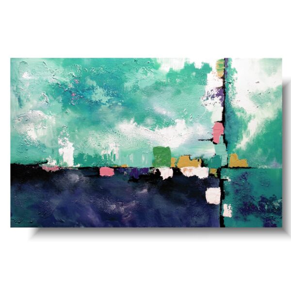 Abstrakcja duży turkusowy obraz w kontrastowej kolorystyce. Idealnie pasuje do modnego wnętrza – salonu, sypialni, przedpokoju czy biura. Oprócz standardowych farb używamy często zaskakujących technik oraz tworzyw malarskich. Posiadamy wiele modnych wzorów oraz klasycznych motywów. Gdyby jednak zamarzyło się Państwu coś zupełnie odmiennego – malujemy obrazy na zamówienie, portret na zamówienie, obrazy kwiaty, obrazy abstrakcje obrazy postacie.