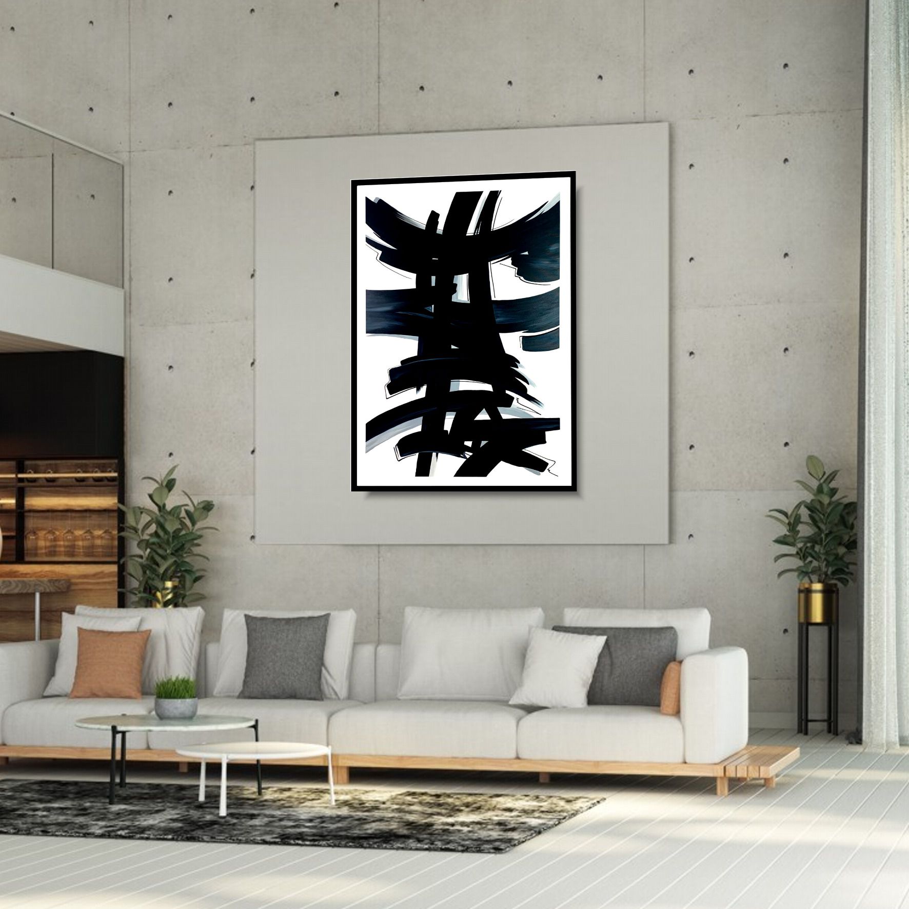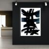 Czarno biały obraz japoński w ramie abstrakcja „Japoński znak” składa się z 1 części + rama w komplecie.