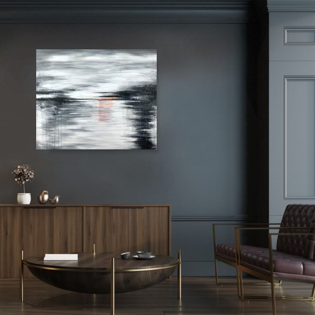 Duża elegancka abstrakcja „Odbicie” naszego autorstwa to niekonwencjonalne dzieło pod względem formalnym jaki i warsztatowym. Tworzymy modne obrazy w dużym formacie aby mogły ozdobić nowoczesny salon czy zaciszną sypialnię. Kolekcje obrazów nawiązują do klasycznych wzorców i najnowszych trendów. Mamy w swojej ofercie obrazy jednoczęściowe, jak i obrazy dzielone na kilka części – takie jak dyptyk, tryptyk. Możemy namalować każdy obraz w zmienionym wymiarze i w innej kolorystyce.