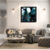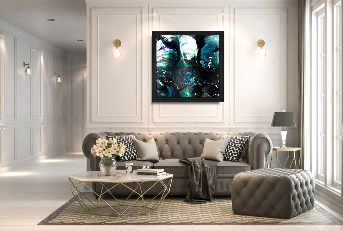 Duży obraz abstrakcja szmaragdowa „Z kosmosu” w czarnej drewnianej ramie 2027A składa się z 1 części + rama – stanowią komplet.