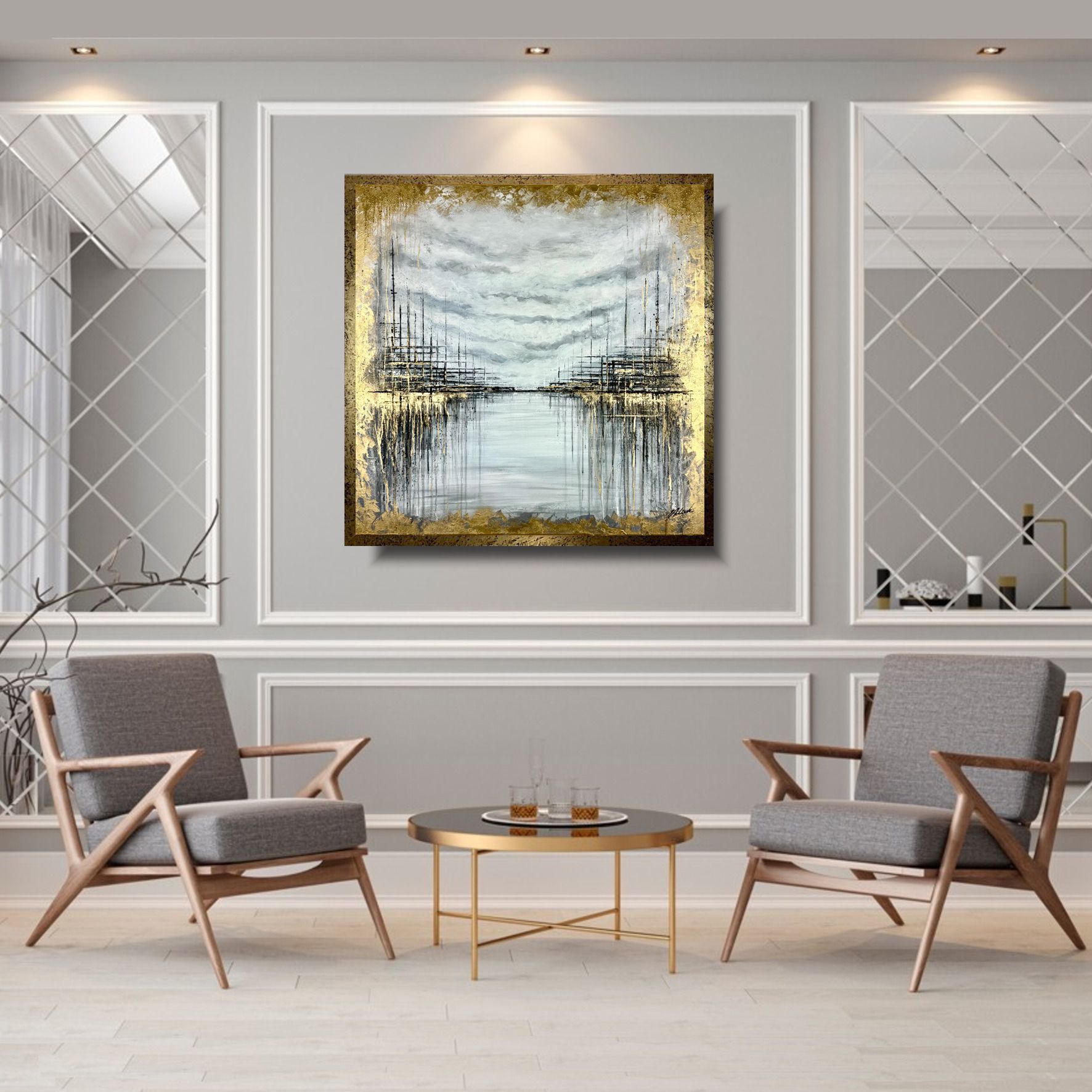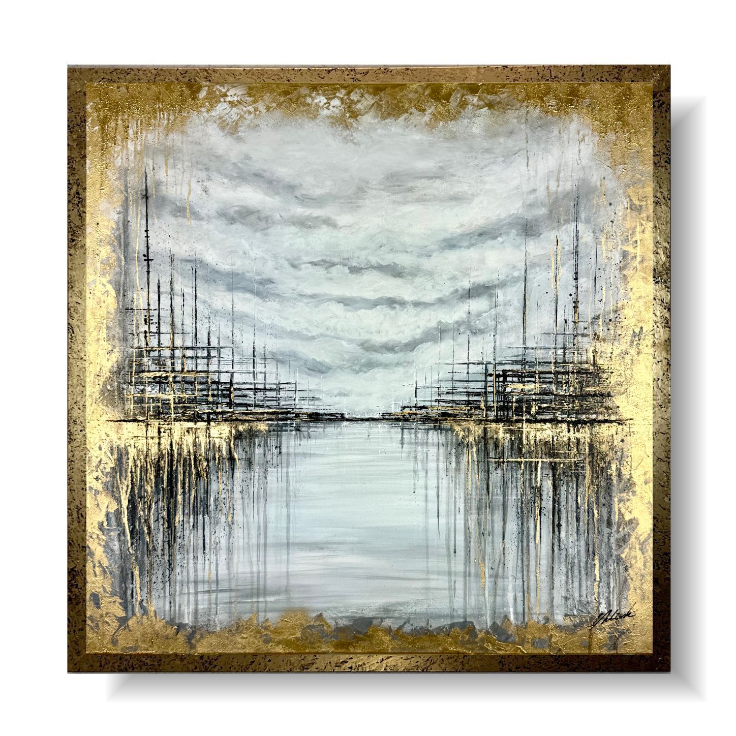 Elegancki obraz w ramie tajemnicze nabrzeże, to dzieło które w abstrakcyjny sposób przedstawia nabrzeże portowe widziane z pokładu statku. Delikatne złote muśnięcia jak przez rozproszoną mgłę ukazują daleki wyczekany ląd. Całość artystycznego zamysłu zamknięta została w piękną złotą ramę, indywidualnie wykonaną specjalnie do tej wizji obrazu. Elegancki marynistyczny złoty obraz ręcznie malowany jest niekonwencjonalny dlatego jest idealny do Twojego wnętrza. Do namalowania tego obrazu użyto ciepłej palety barw z odrobiną chłodu. Piękne złote refleksu obrazu cieszą oczy i ocieplają koncepcję obrazu. Abstrakcja to nasza specjalność dlatego inne klasyczne formy malarstwa staramy się przestawić w abstrakcyjny sposób. Obraz w dużym formacie, nowoczesne obrazy do salonu, modne obrazy do biura, eleganckie obrazy do mieszkania mogą ożywić każde wnętrze – dom, firmę, mieszkanie.
