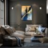 Elegancki obraz w ramie burza piaskowa abstrakcja ręcznie malowana jest niekonwencjonalny pod względem formalnym jaki i warsztatowym. Do namalowania tego obrazu użyto najmodniejszej barw i dodano złoty brokat. Piękne złote refleksy obrazu cieszą oczy. Abstrakcja to nasza specjalność.