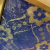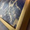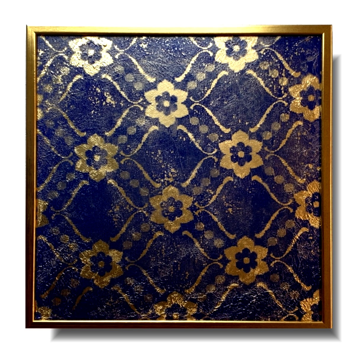 Obrazek do salonu „Granat love kwiaty” w ramie 2201A w to mały delikatny obraz w dwóch kontrastujących kolorach złota i granatu. Wzorzysta abstrakcja ręcznie malowana w złotej prostej ramie. Abstrakcja to nasza specjalność.