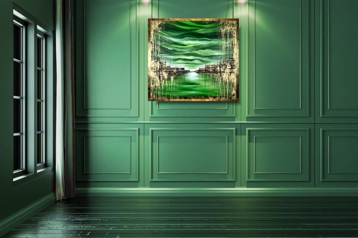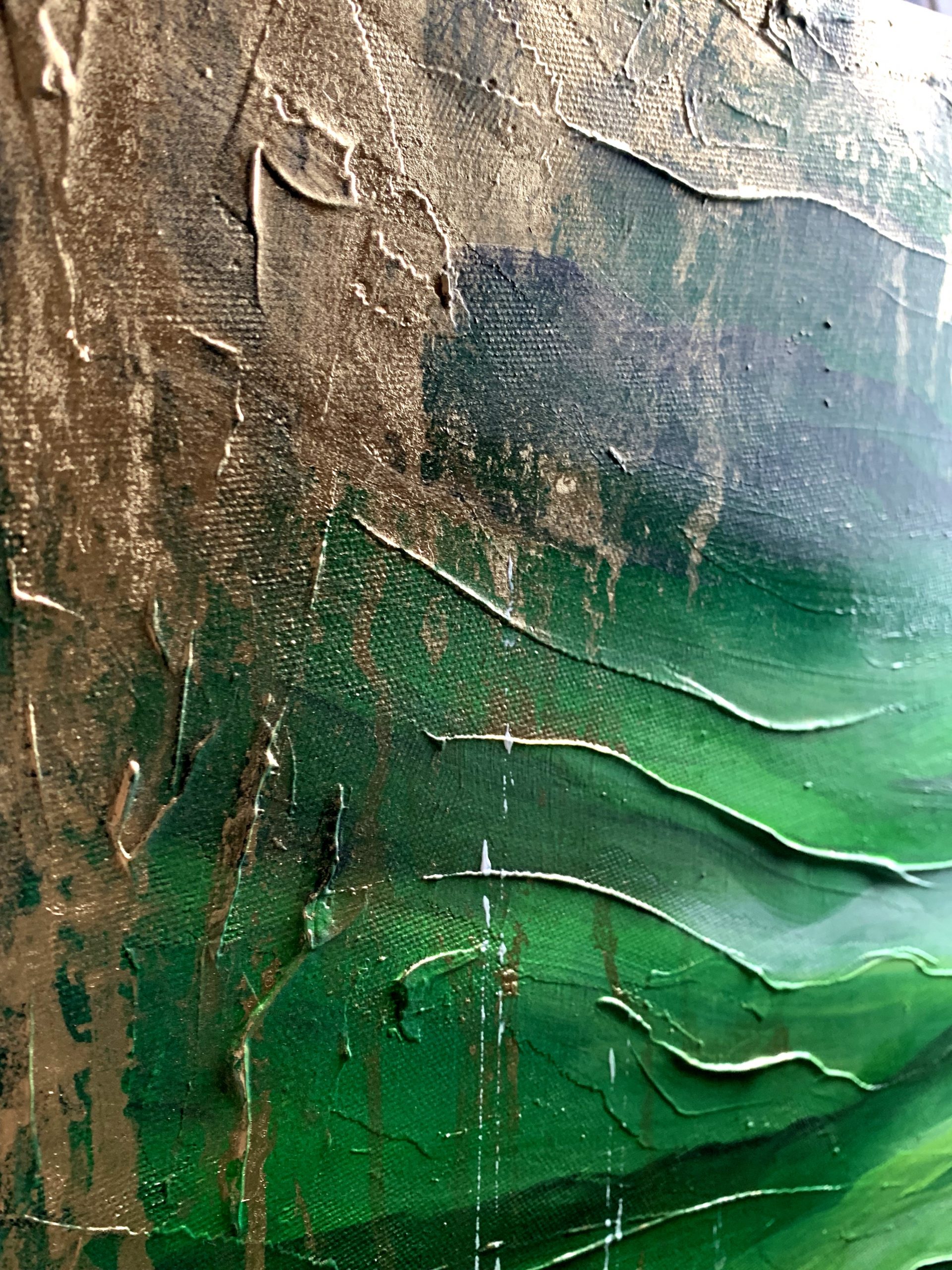 Do namalowania tego obrazu użyto soczystej zielonej palety barw z odrobiną złota. Piękne złote refleksu obrazu skrzą i mienią się w blasku światła. Abstrakcja to nasza specjalność dlatego inne klasyczne formy malarstwa staramy się przestawić w abstrakcyjny sposób. Obraz w dużym formacie, nowoczesne obrazy do salonu, modne obrazy do biura. Eleganckie obrazy do mieszkania mogą ożywić każde wnętrze – dom, firmę a także mieszkanie.