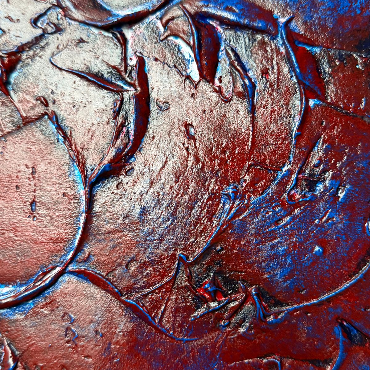 Nowoczesna abstrakcja „Błękitna krew” to ekspresyjny obraz abstrakcyjny, w którym intensywne bordo/czerwień przeplata się z chłodnymi akcentami błękitu, tworząc dynamiczną i głęboką kompozycję. Wyraźna faktura oraz energiczne, reliefowe pociągnięcia nadają dziełu trójwymiarowości i przyciągają wzrok z każdej perspektywy. Rama w komplecie.