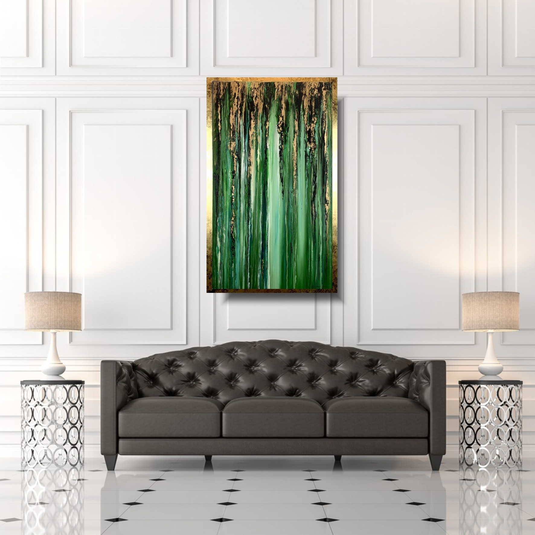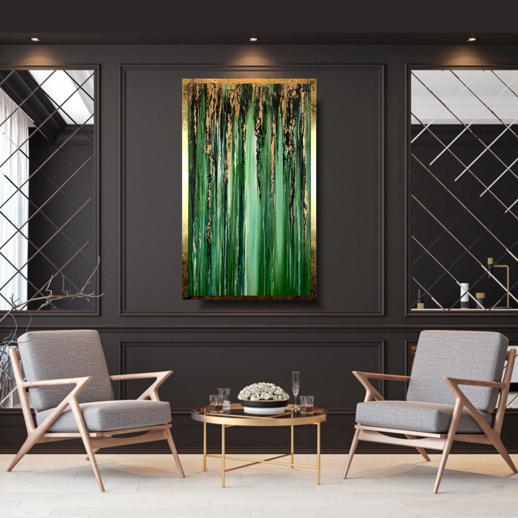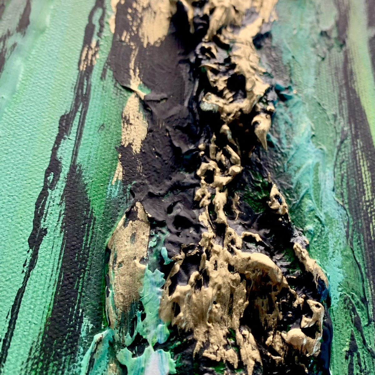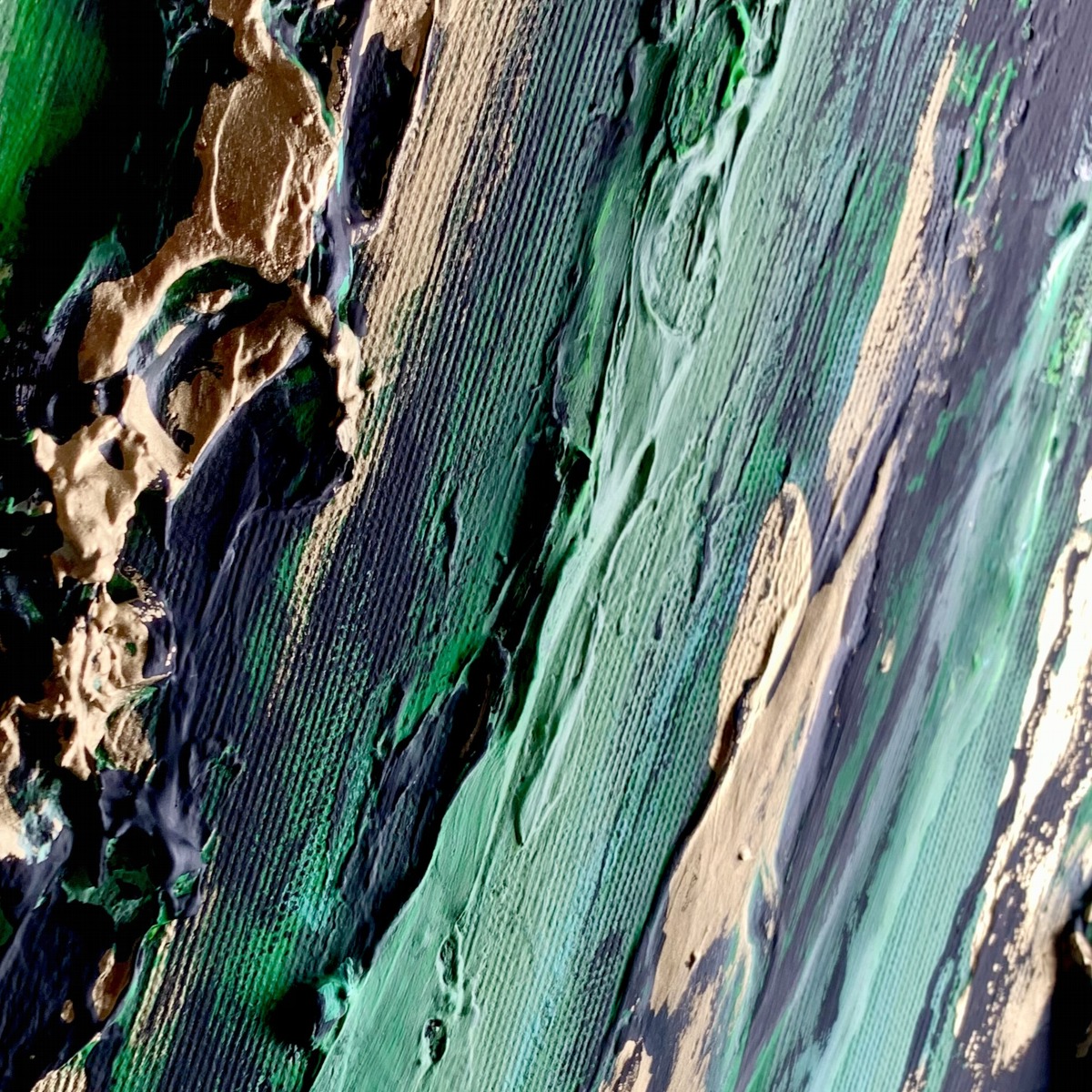 Nowoczesny obraz w ramie „Tropikalna zieleń” abstrakcja to kolejny obraz z serii obrazów „płynących”. Blask zieleni spotęgowany poprzez fakturowe nałożenie farby oraz złociste refleksy poziomo ociekających smug przywodzi na myśl spływającego deszczu po czystej tafli szkła. Nowoczesny obraz w ramie tropikalna zieleń naszego autorstwa w eleganckiej, modnej kolorystyce butelkowej zieleni. Kolory użytej farby akrylowej dodają tajemniczości i powiewu świeżości dlatego nikt nie przejdzie obok niego obojętnie. Obraz idealnie ozdobi nowoczesny salon czy modne biuro. Nowoczesne abstrakcje to nasza specjalność dlatego poświęcamy się im bez reszty. Wykonujemy obrazy marynistyczne, obrazy kwiaty, obrazy aniołów, obrazy dzielone – dyptyk, tryptyk, fortyk, obrazy jednoczęściowe w dużym formacie. Możemy namalować każdy obraz z naszej oferty w zmienionych wymiarach lub kolorystyce, możemy namalować obraz dzielony na jednej części lub obraz jednoczęściowy podzielić na kilka części.