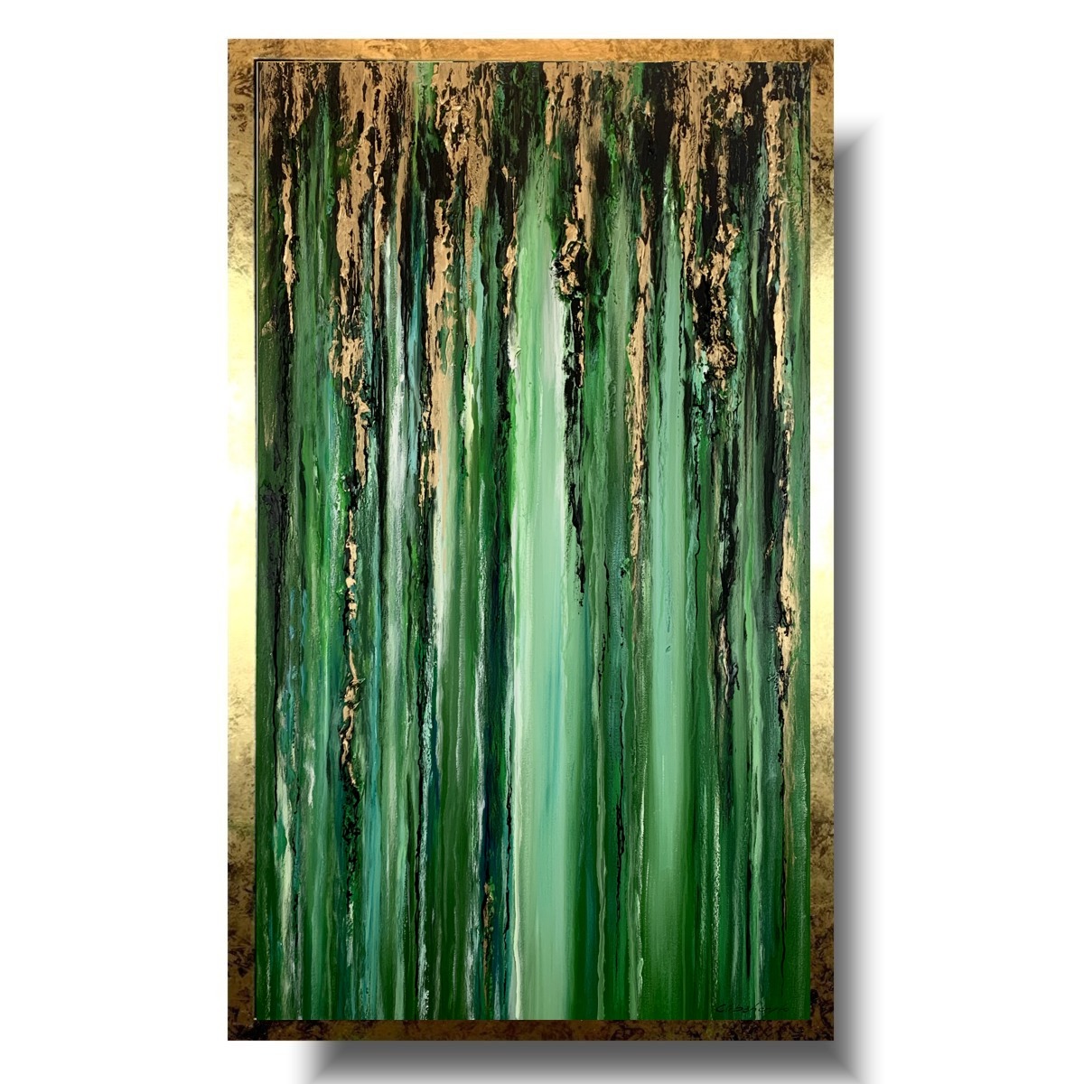Kolorystyka obrazu: złoty, zielony, biały, czarny + złota przecierana rama (listwa szerokości 4cm i grubości 2,5cm) .