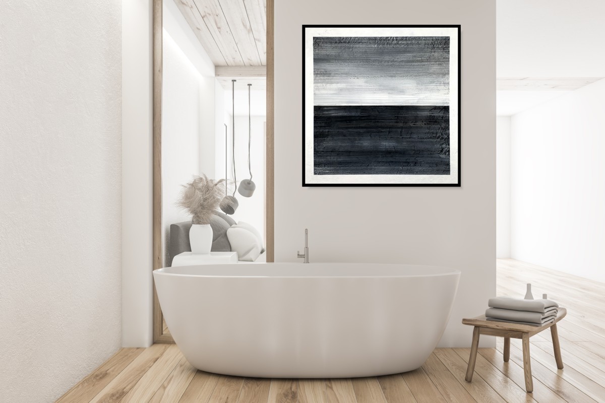 Obraz abstrakcja czarno biała „Na horyzoncie” składa się z 1 części + rama w komplecie