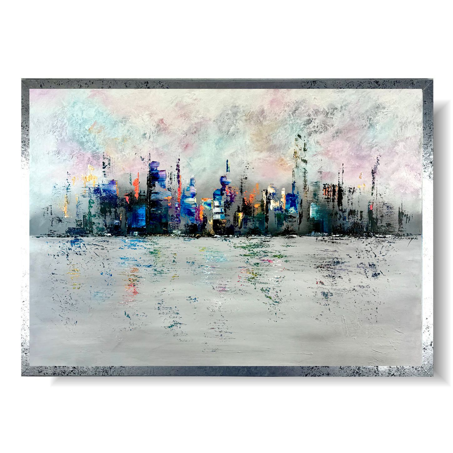 Obraz ręcznie malowany abstrakcja „Kolorowe miasto w oddali” 2177A naszego autorstwa to delikatny pastelowy obraz. W komplecie jest pasująca stylistycznie rama aby całość stanowiła idealną dekorację salonu, sypialni czy biura.