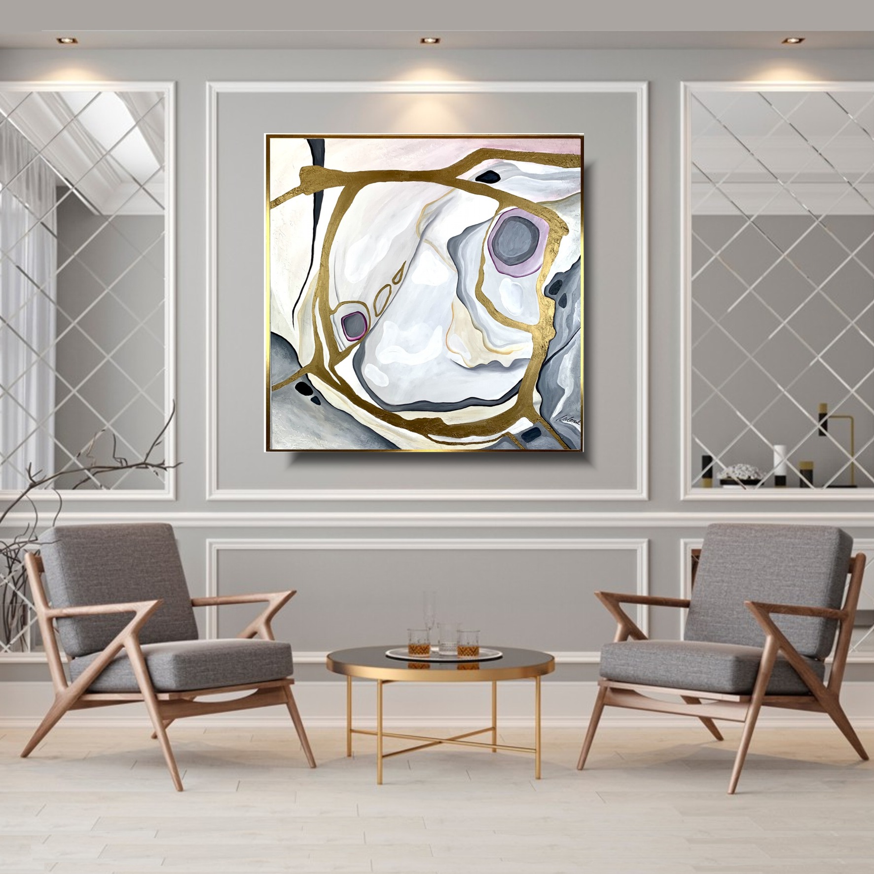 Obraz do salonu żyła złota abstrakcja w ramie to piękna delikatna geometryczna abstrakcja w bladym pudrowym różu. Abstrakcja ręcznie malowana w stonowanej kolorystyce i złotej prostej ramie. Abstrakcja to nasza specjalność.