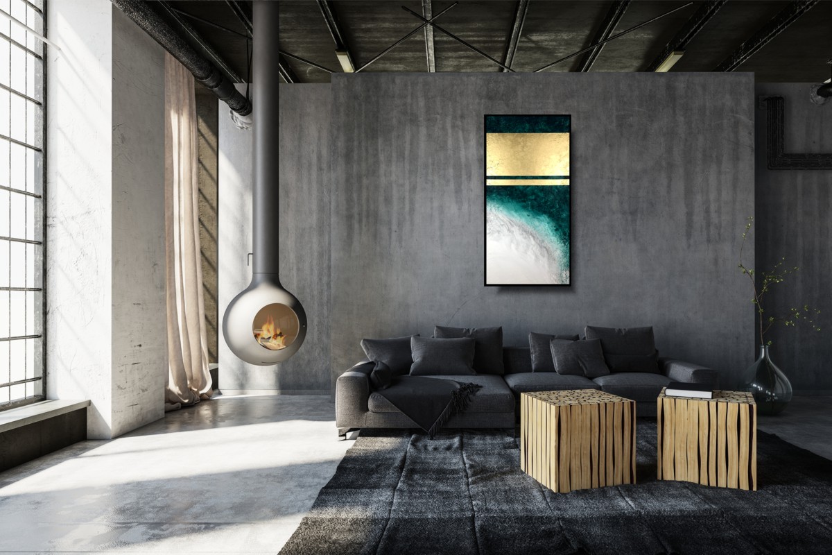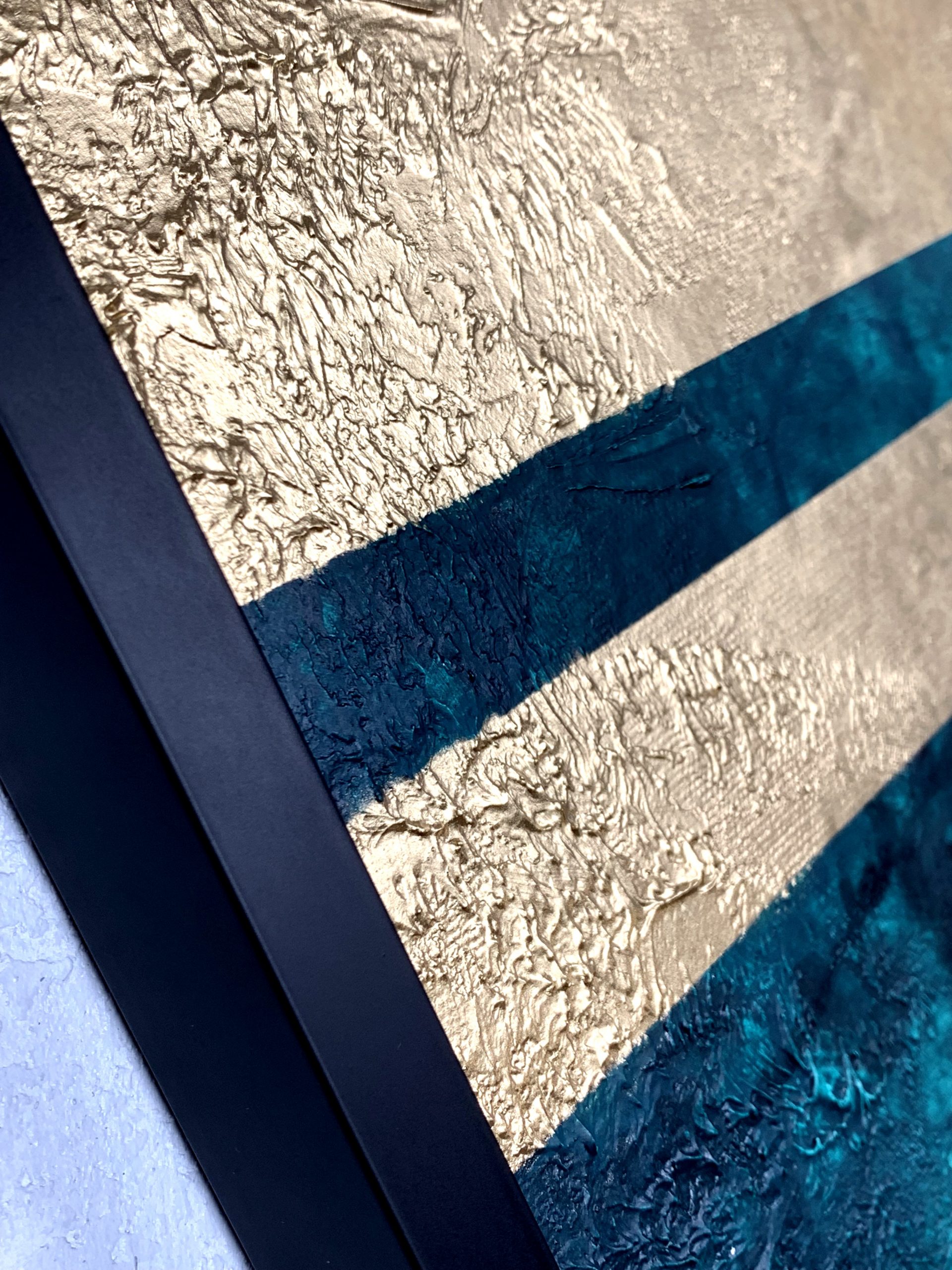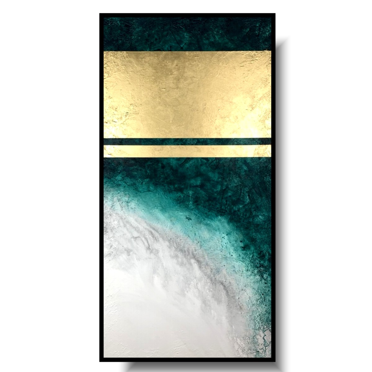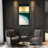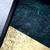 Obraz do salonu szmaragdowe wybrzeże to nowoczesna zielona abstrakcja przepasana złotem. To piękny pionowy obraz w prostej czarnej ramie.