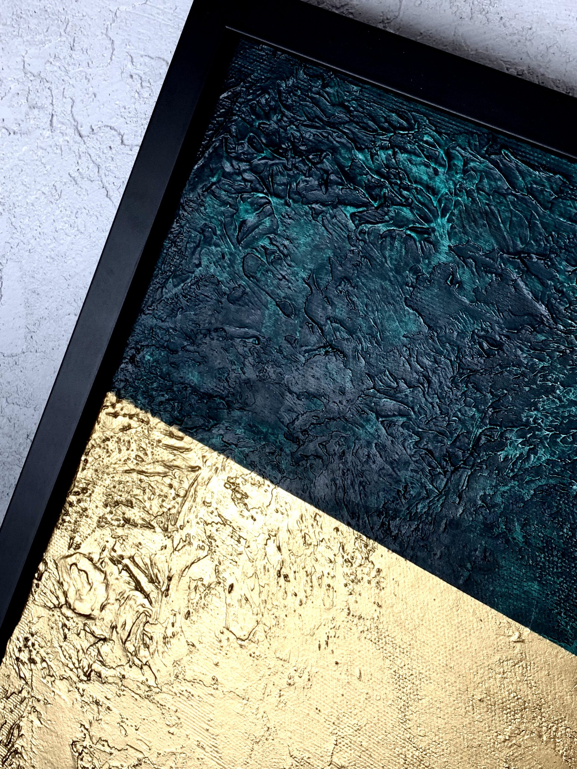 Obraz abstrakcja szmaragdowo złoty składa się z 1 części + rama w komplecie