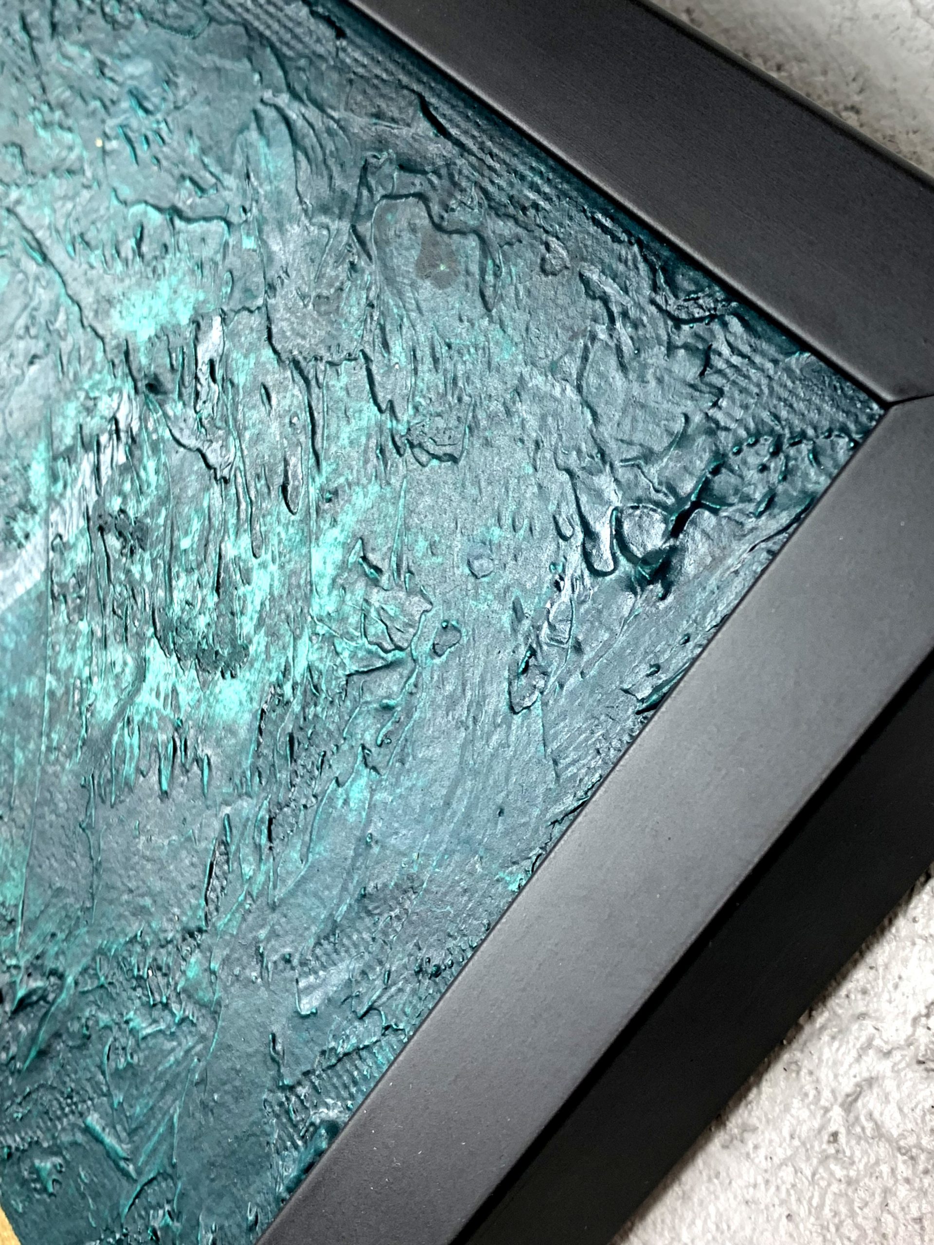 Kolorystyka obrazu: zielony/szmaragdowy, złoty, biały, szary + czarna rama (szerokość listwy 1,5cm)