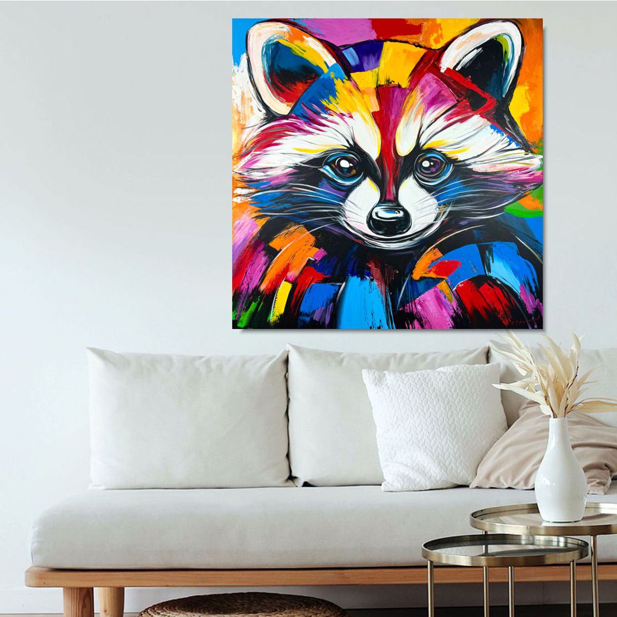 Obraz abstrakcja „Kolorowy szop pracz” 2343A Ten wyjątkowy obraz przedstawiający szopa w intensywnej, ekspresyjnej kolorystyce to doskonałe połączenie nowoczesnej sztuki i designerskiego stylu. Dynamiczne pociągnięcia pędzla oraz odważna paleta barw sprawiają, że dzieło natychmiast staje się centralnym punktem każdego wnętrza.