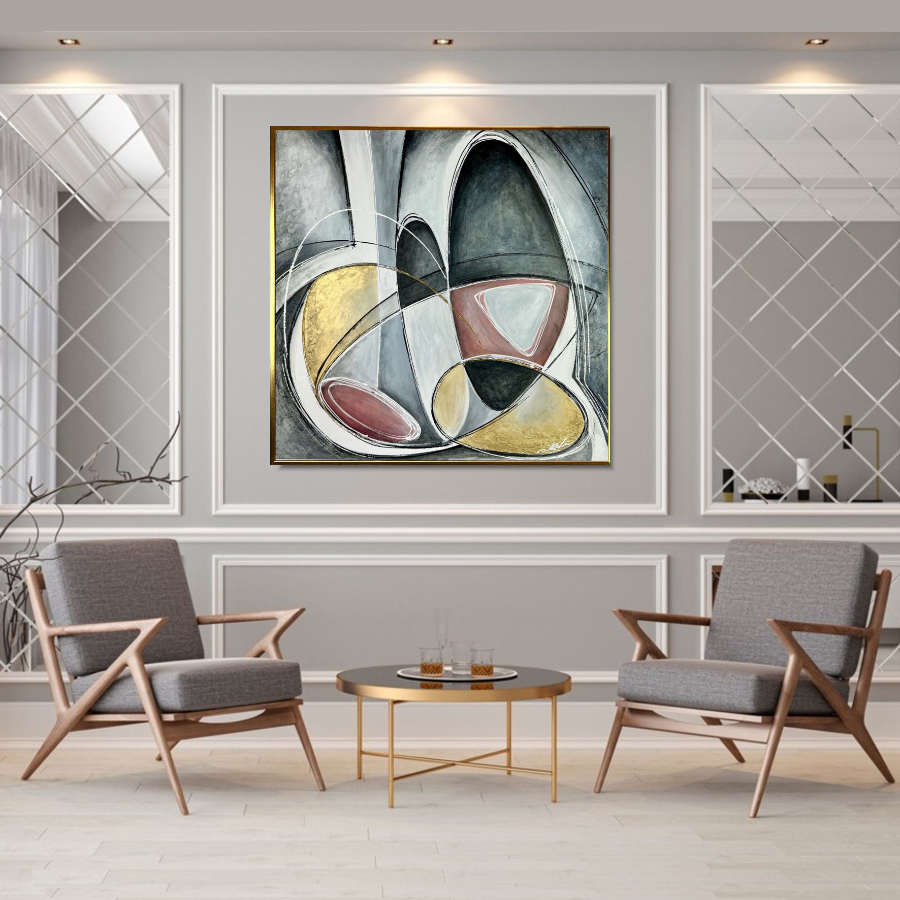 Kolorystyka obrazu: szary, złoty, brudny róż /mahoń + złota rama