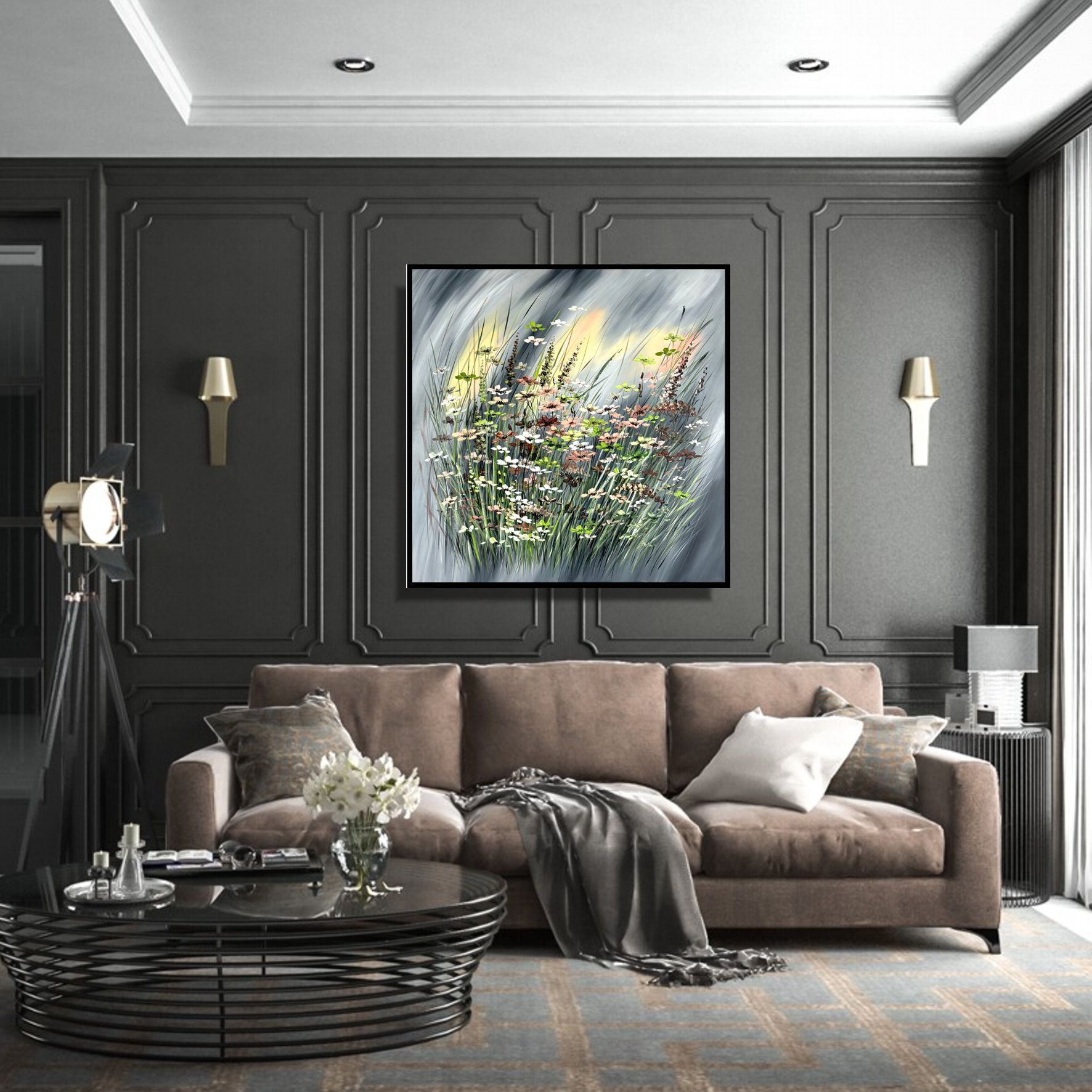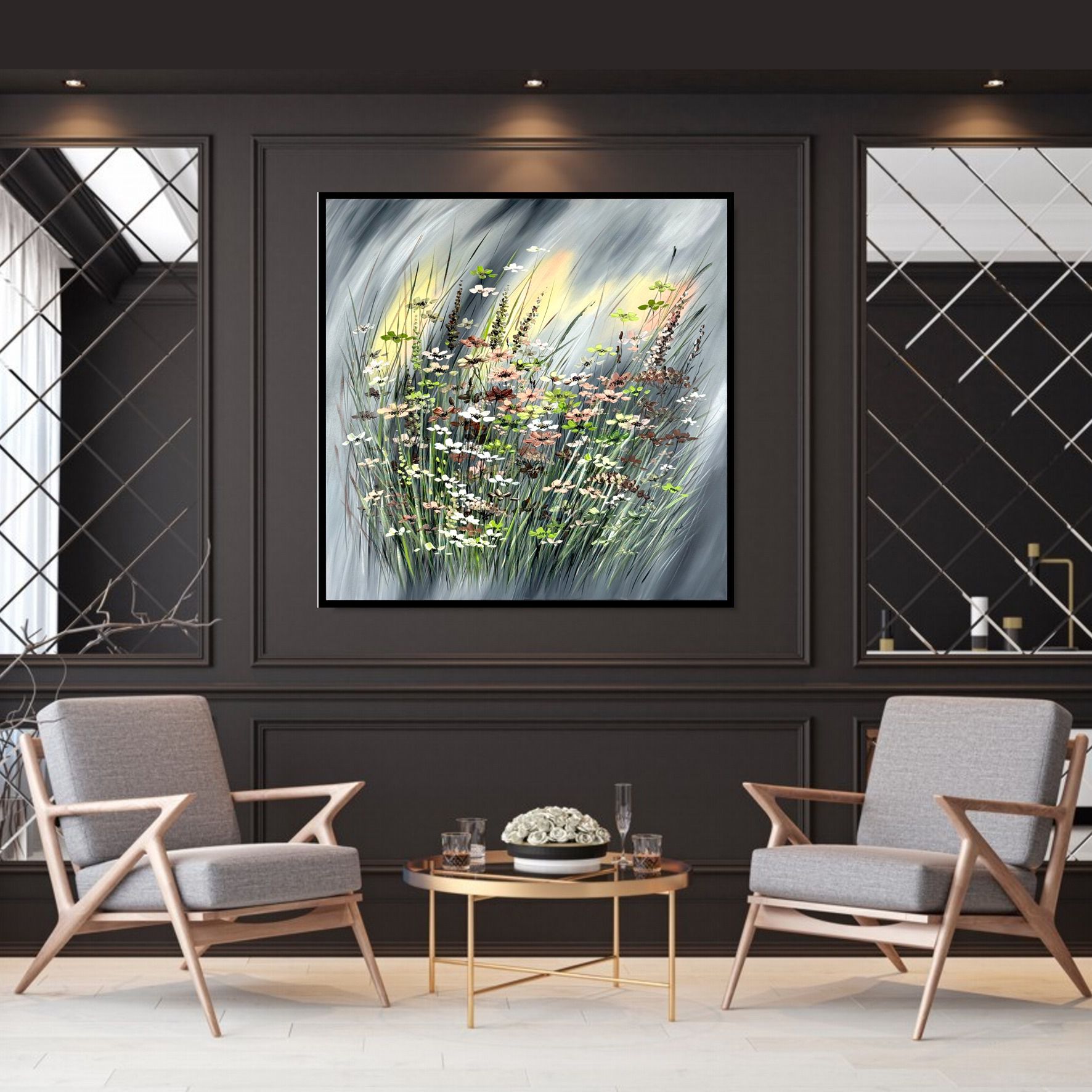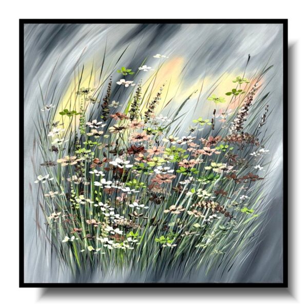 Obraz z kwiatami malowany na płótnie „Burzowa aura” 2249A. Na płótnie widzimy spokojne i stonowane tło w odcieniach szarości. To jakby płaszczyzna spokoju, na której małe dzieło sztuki znajduje swój wyjątkowy kontekst. Kontrast między oliwkową ramą a szarością tła podkreśla elegancję i subtelność.