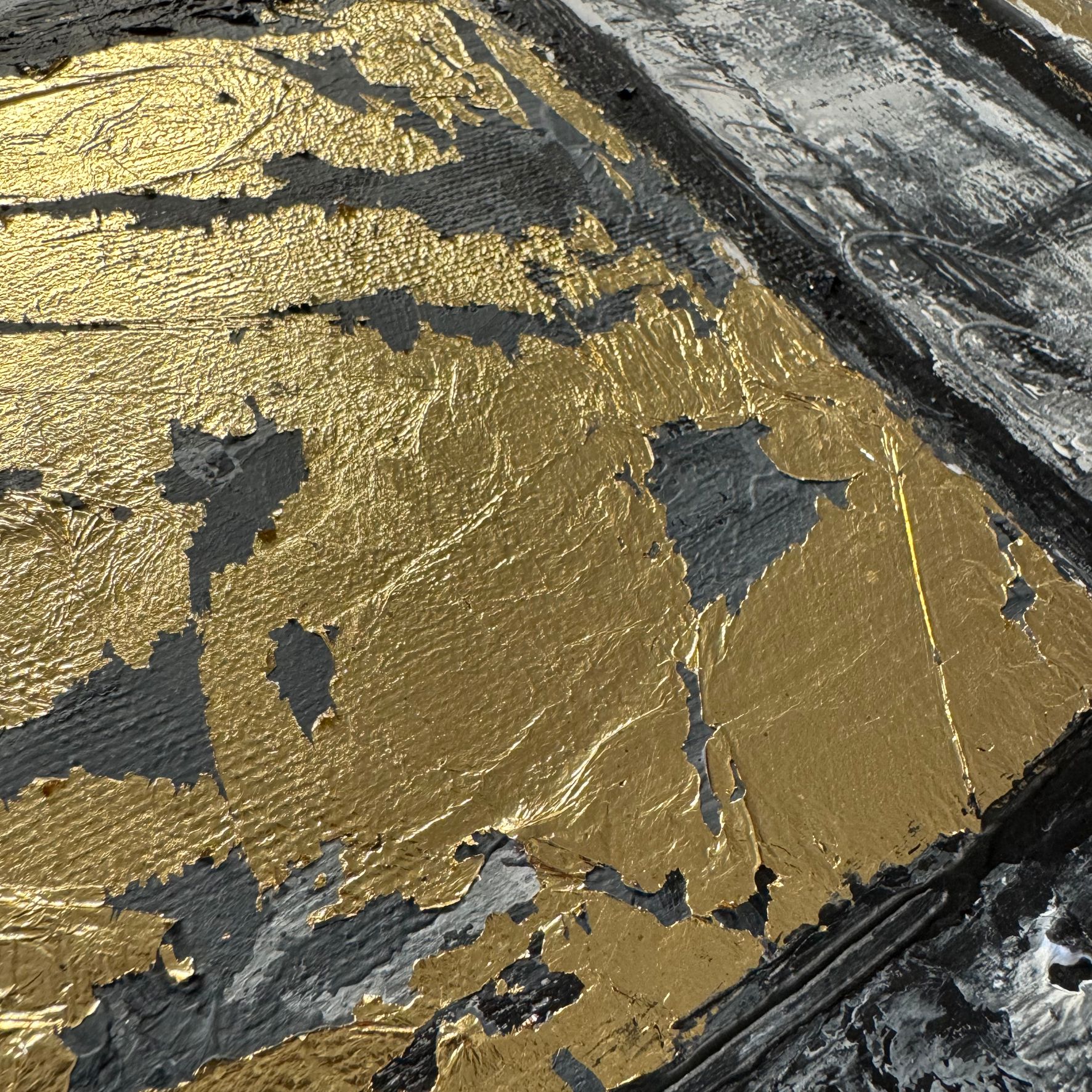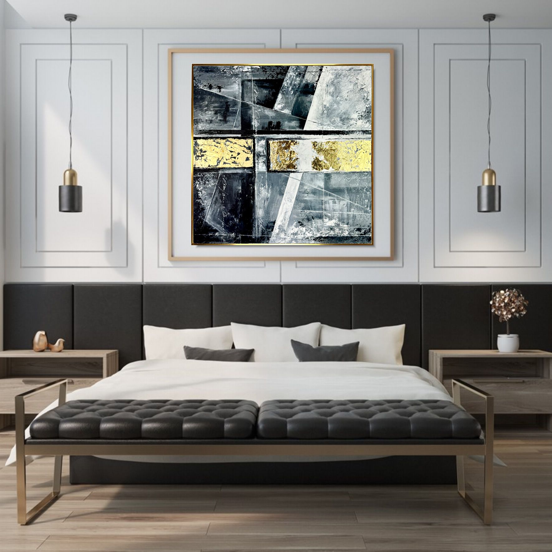 Kolorystyka obrazu: złoty, szary, biały, czarny + złota rama (szerokość listwy 1,5cm)