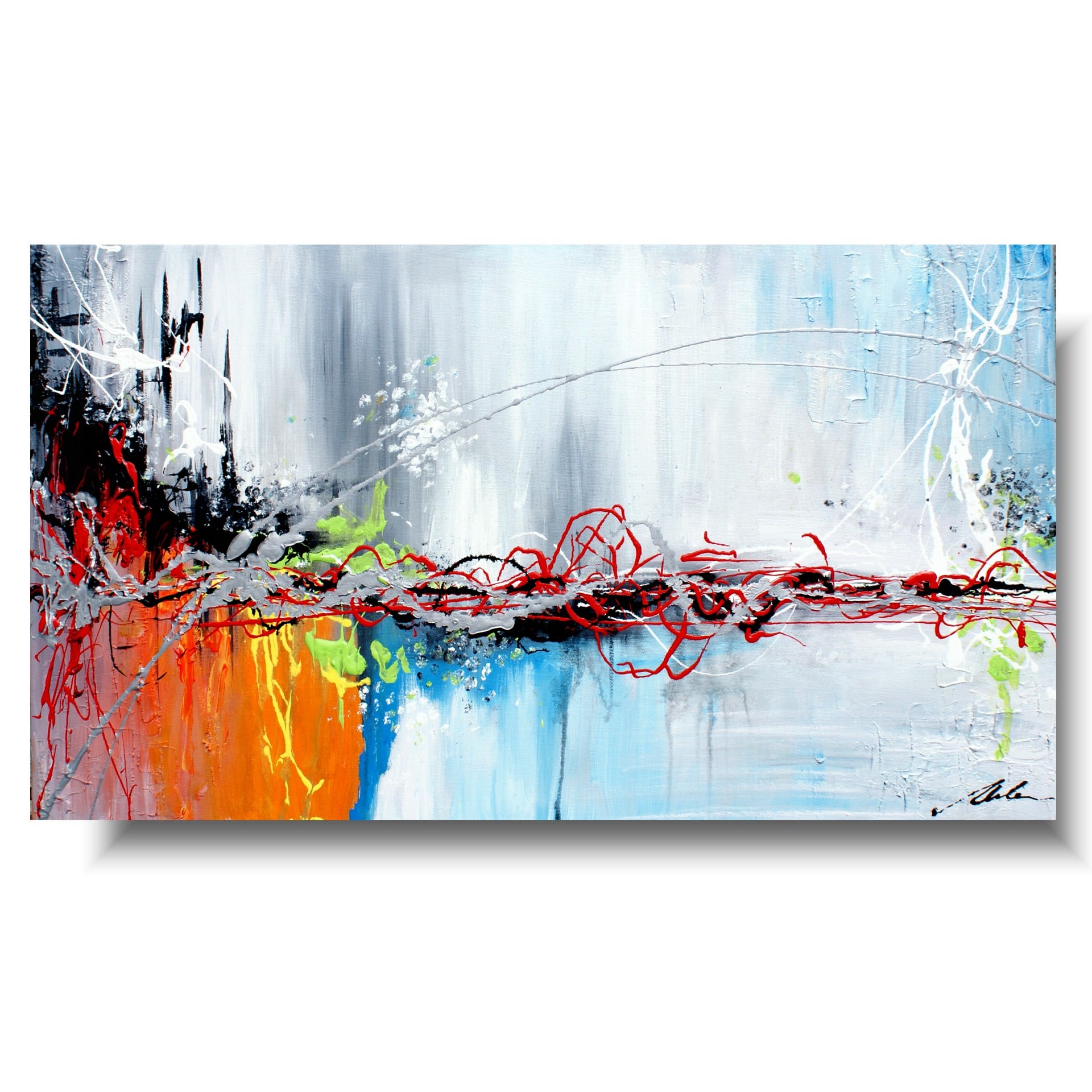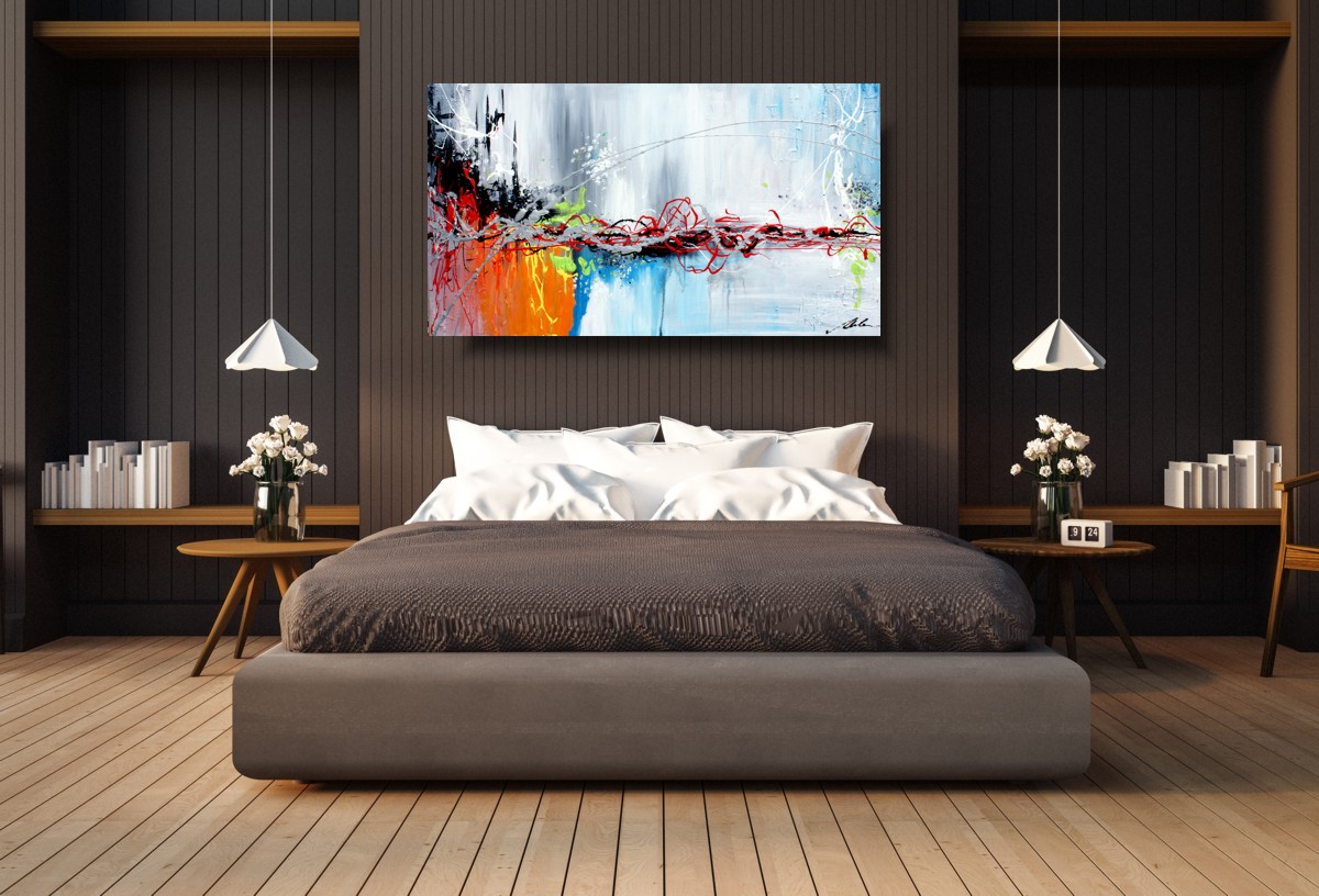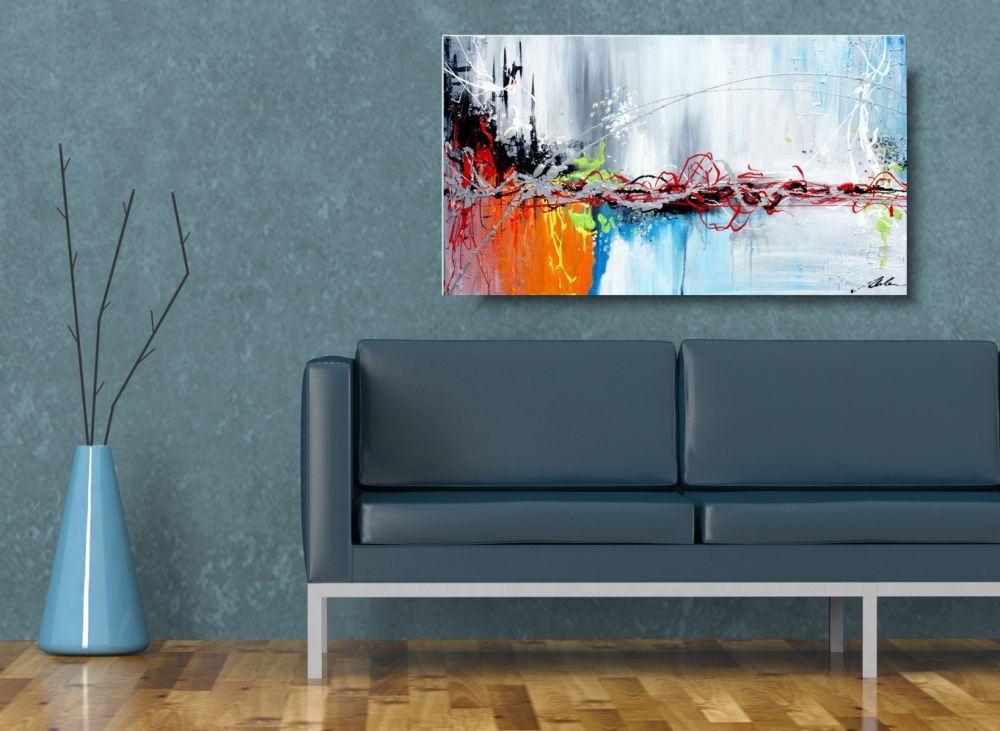 Abstrakcja prezentowana to obraz w dużym formacie, pełen pozytywnej energii w żywej kolorystyce. Obraz nowoczesny jest niekonwencjonalny pod względem formalnym jak i warsztatowym. Do namalowania tego obrazu użyto całej palety barw, co daje efekt nowoczesnego designu. Obraz może ożywić modne jednobarwne wnętrze – salon, biuro, korytarz. W tej chwili są modne wnętrza monochromatyczne, minimalistyczne w których obraz to jedyne źródło koloru. Na specjalne życzenie Klientów wykonujemy także obrazy na zamówienie. Zapraszamy do bezpłatnej konsultacji mailowej sklep@dobrasztuka.pl. Bardzo chętnie pomożemy w doborze odpowiedniego obrazu do wnętrza.