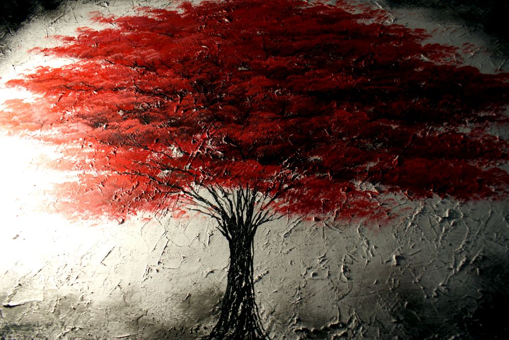 Obraz japońskie czerwone drzewo „Ogniste drzewo” ,drzewo życia. Przedstawienie drzewa w centrum obrazu, jako najważniejszego punktu, w bardzo wyrazistych kolorach jaką jest czerwień , wyróżnia ten obraz na tle innych. Mocno widoczna faktura na obrazie poprzez użycie techniki impaso i użycie perspektywy malarskiej dodaje głębi całej kompozycji.
