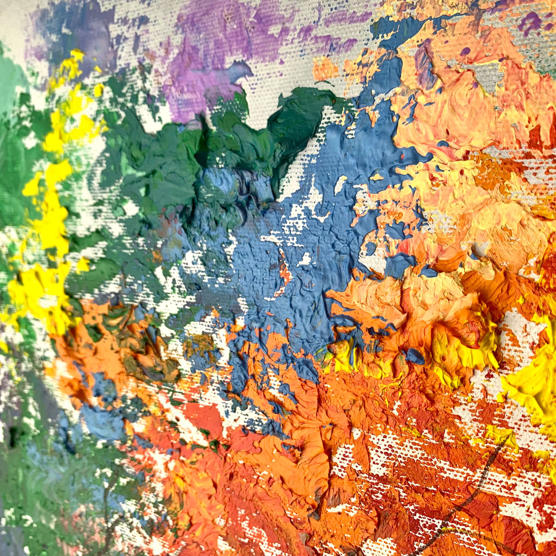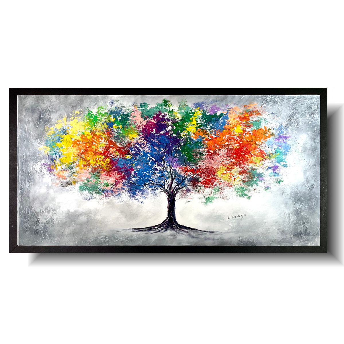 Obraz ręcznie malowany na płótnie „Drzewo dobrych myśli” 2216A to abstrakcyjna wizja drzewa w bardzo pozytywnych kolorach. To wesoły, delikatny obraz w prostej czarnej ramie.