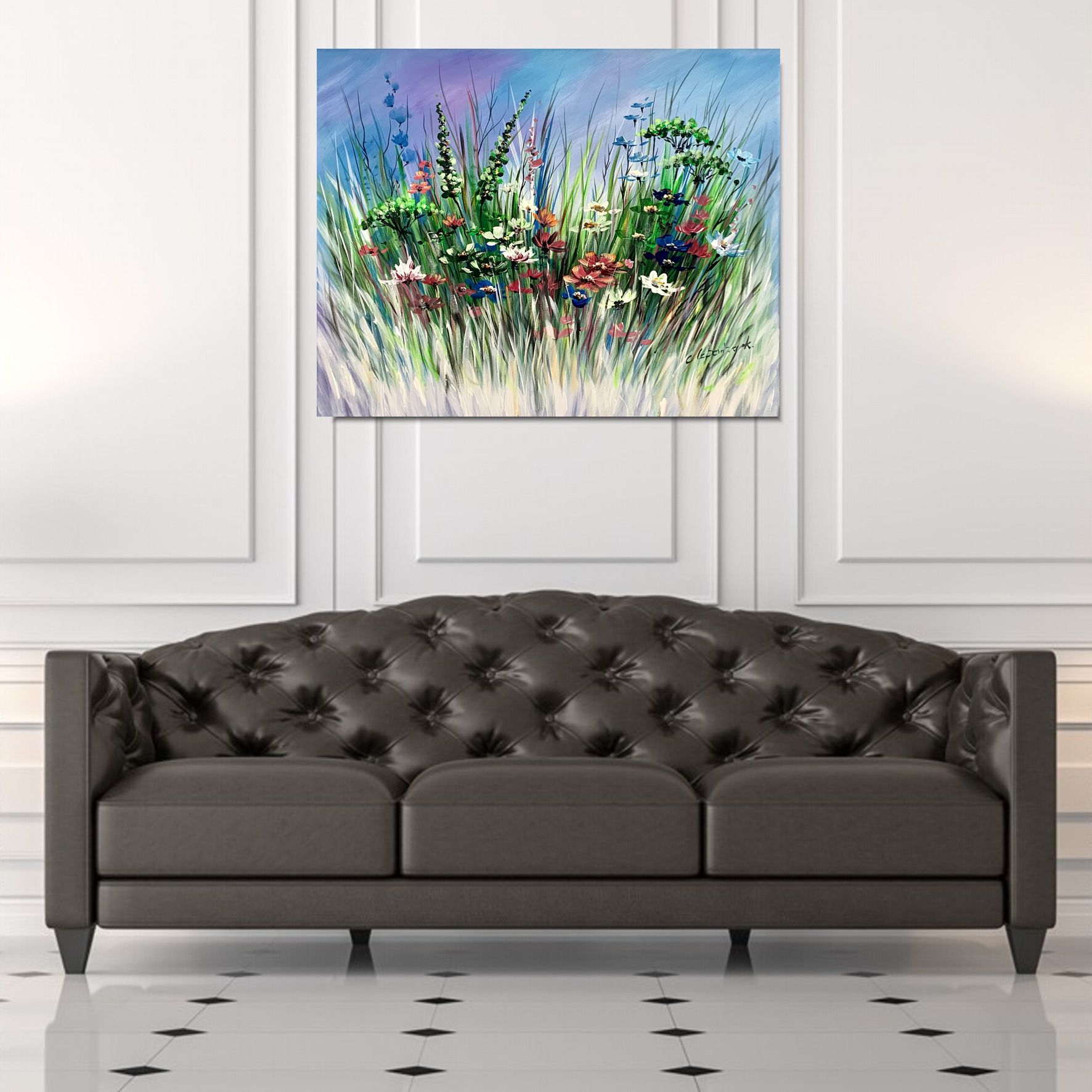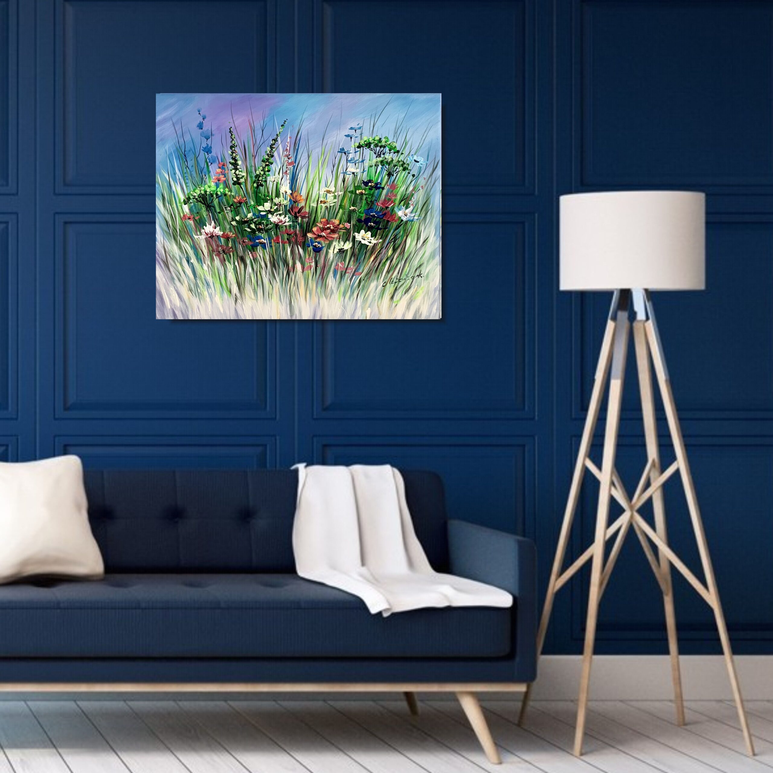Obraz ręcznie malowany na płótnie „Letnia łąka” 2268A. Ten delikatny obraz przenosi nas w spokojny i chłodny świat pełen ukojenia, gdzie rumianki i wrotycze tworzą malowniczy pejzaż. Cała kompozycja jest nasycona chłodnymi odcieniami, tworząc wrażenie spokoju i harmonii. to obraz, który przywołuje uczucie wyciszenia i zadumy, przenosząc nas do spokojnego zakątka przyrody, gdzie można oderwać się od zgiełku dnia i zanurzyć się w błogim pięknie natury.