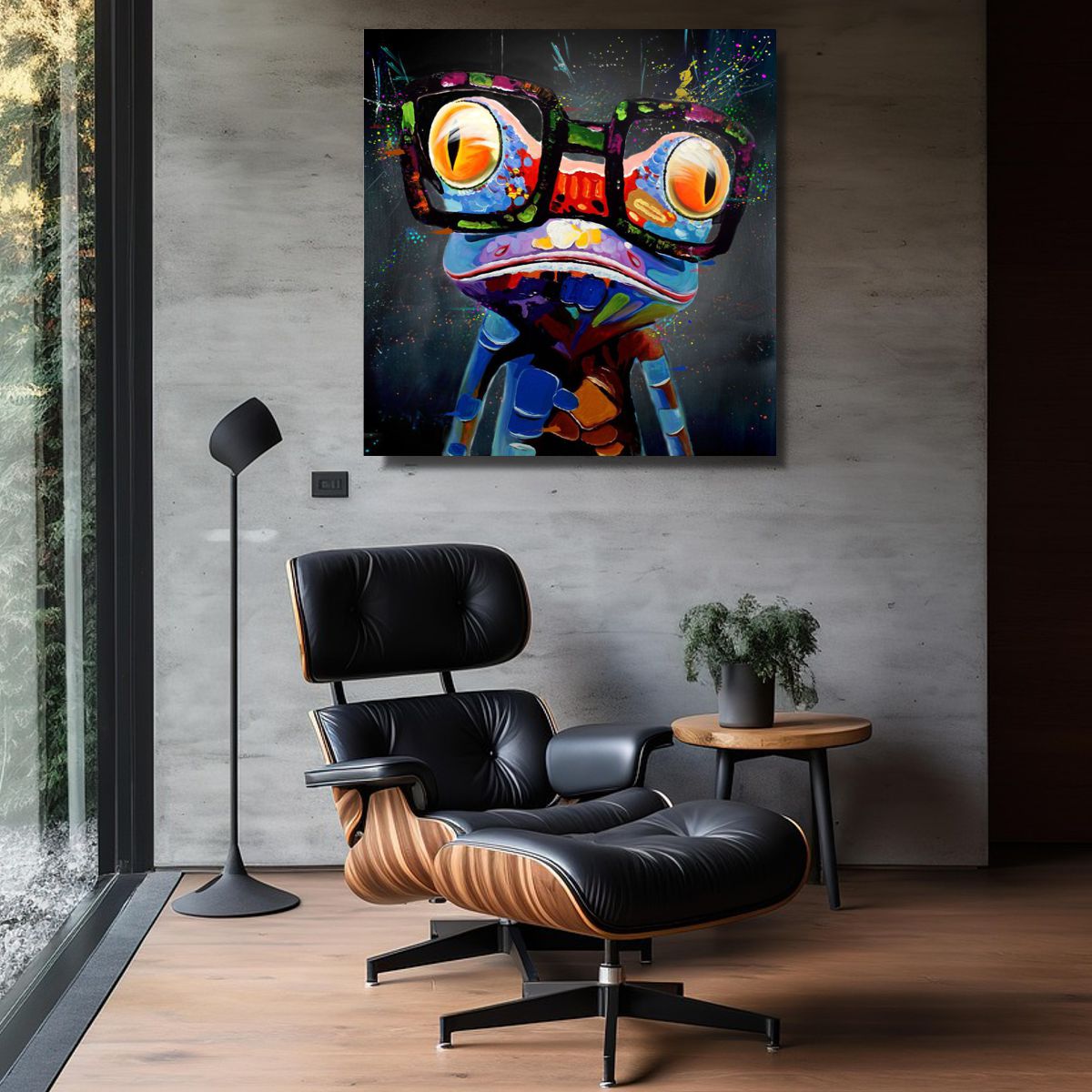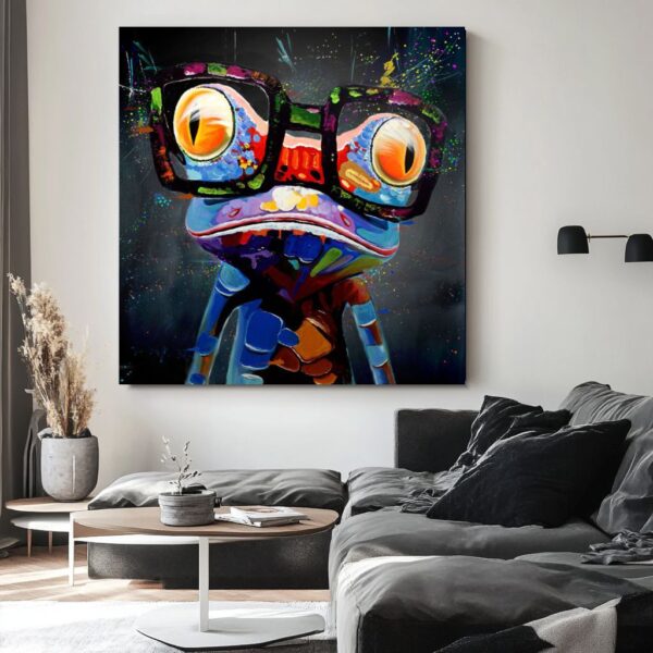 Obraz na płótnie „Zabawna żaba” obrazy ze zwierzętami 2350A naszego autorstwa przedstawiający kolorową żabę w ciekawej stylizacji na ciemnym tle. Mino to kolory użytej farby poprawiają humor i nastrajają pozytywnie. Ten obraz to idealna ozdoba nowoczesnego salonu czy modnego biura. Malujemy także obrazy z kwiatami, obrazy do biura, obrazy z postaciami, obrazy portrety, duże obrazy na ścianę, obrazy do salonu, nowoczesne obrazy.