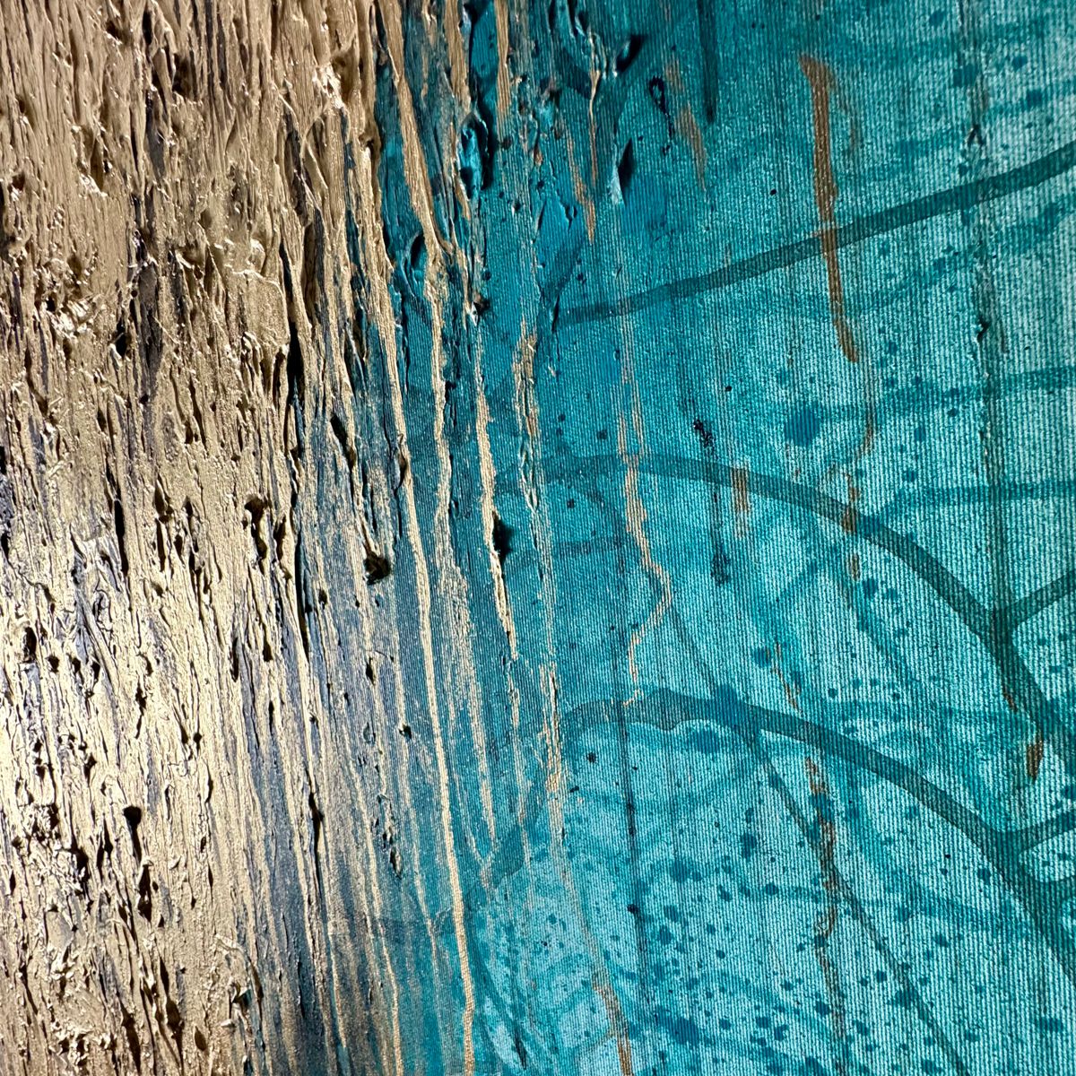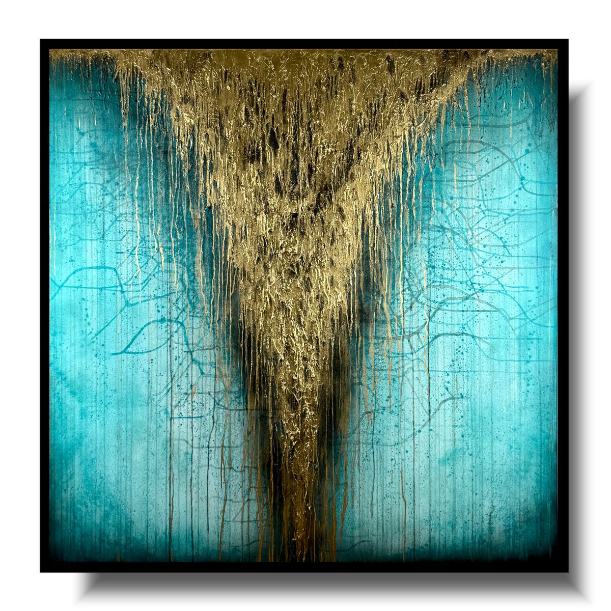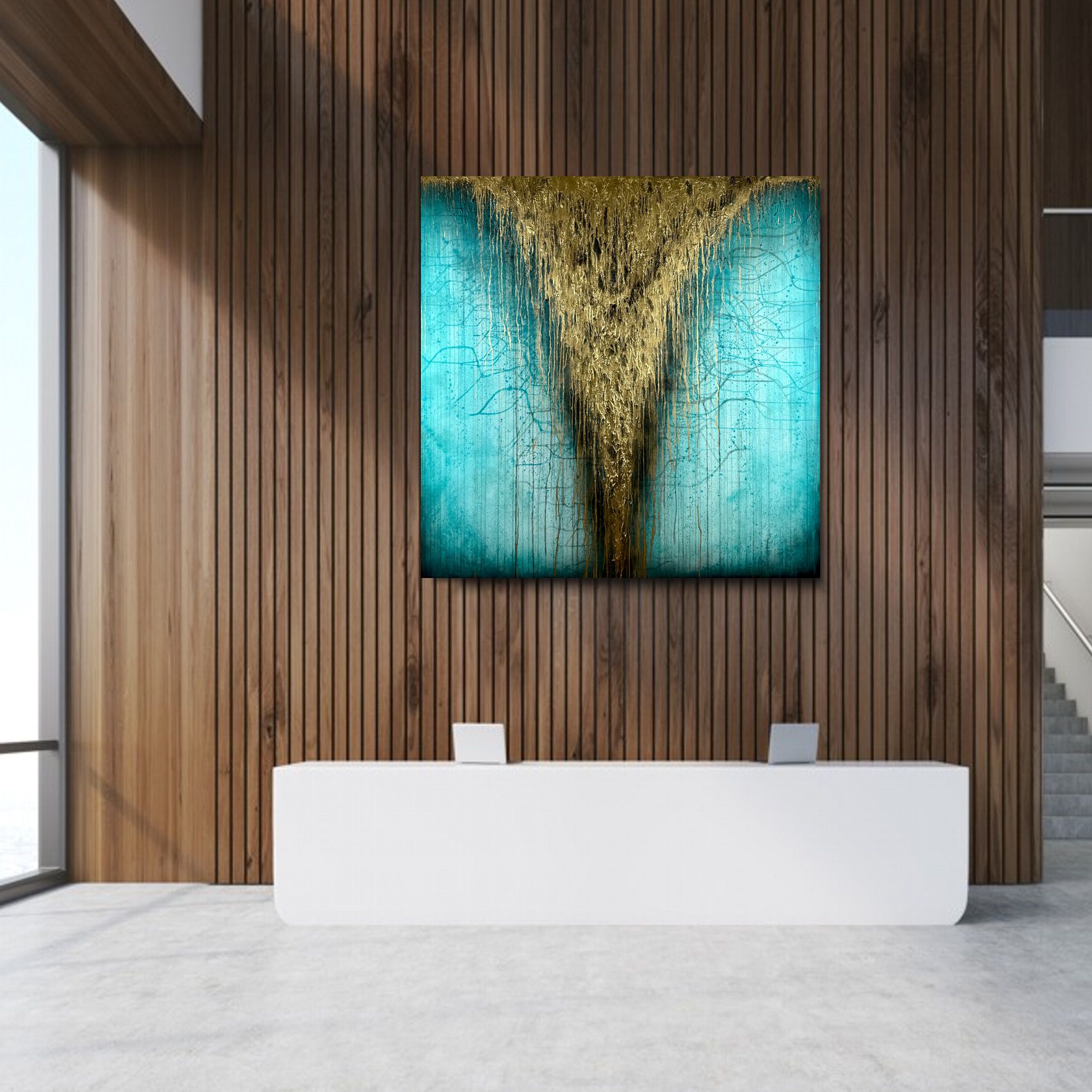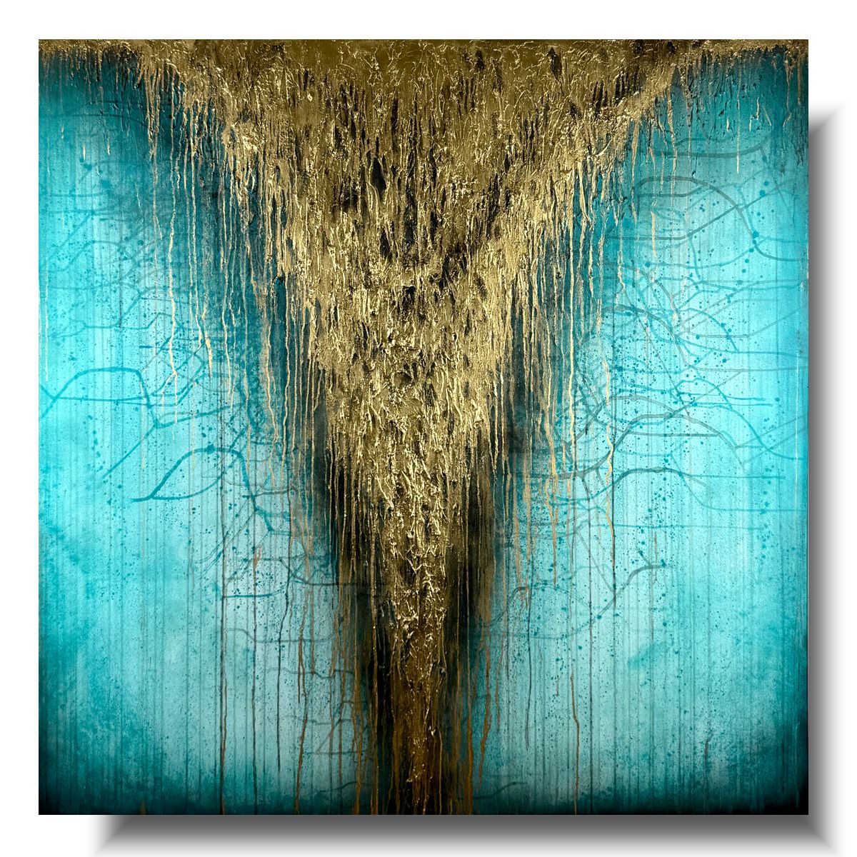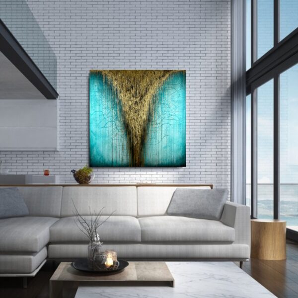 Obraz ręcznie malowany na płótnie „Turkusowy potok” 1966A – to abstrakcyjne dzieło sztuki w dużym formacie i z widoczną fakturą farby. Centralnym punktem jest wyrazisty złoty wodospad na spokojnym turkusowym tle, który przyciąga wzrok.