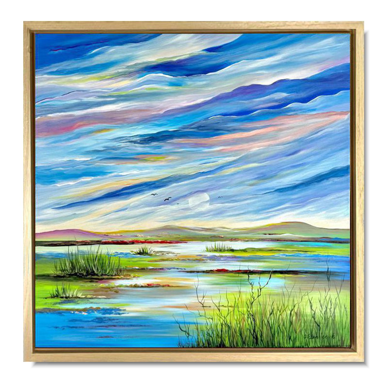 Obraz ręcznie malowany na płótnie „Ptaki w szuwarach” 2147A naszego autorstwa w letniej kolorystyce. Użyte farby akrylowe są w pozytywnych, letnich kolorach a rama z naturalnego drewna. Idealnie ozdobi nowoczesny salon czy modne biuro.