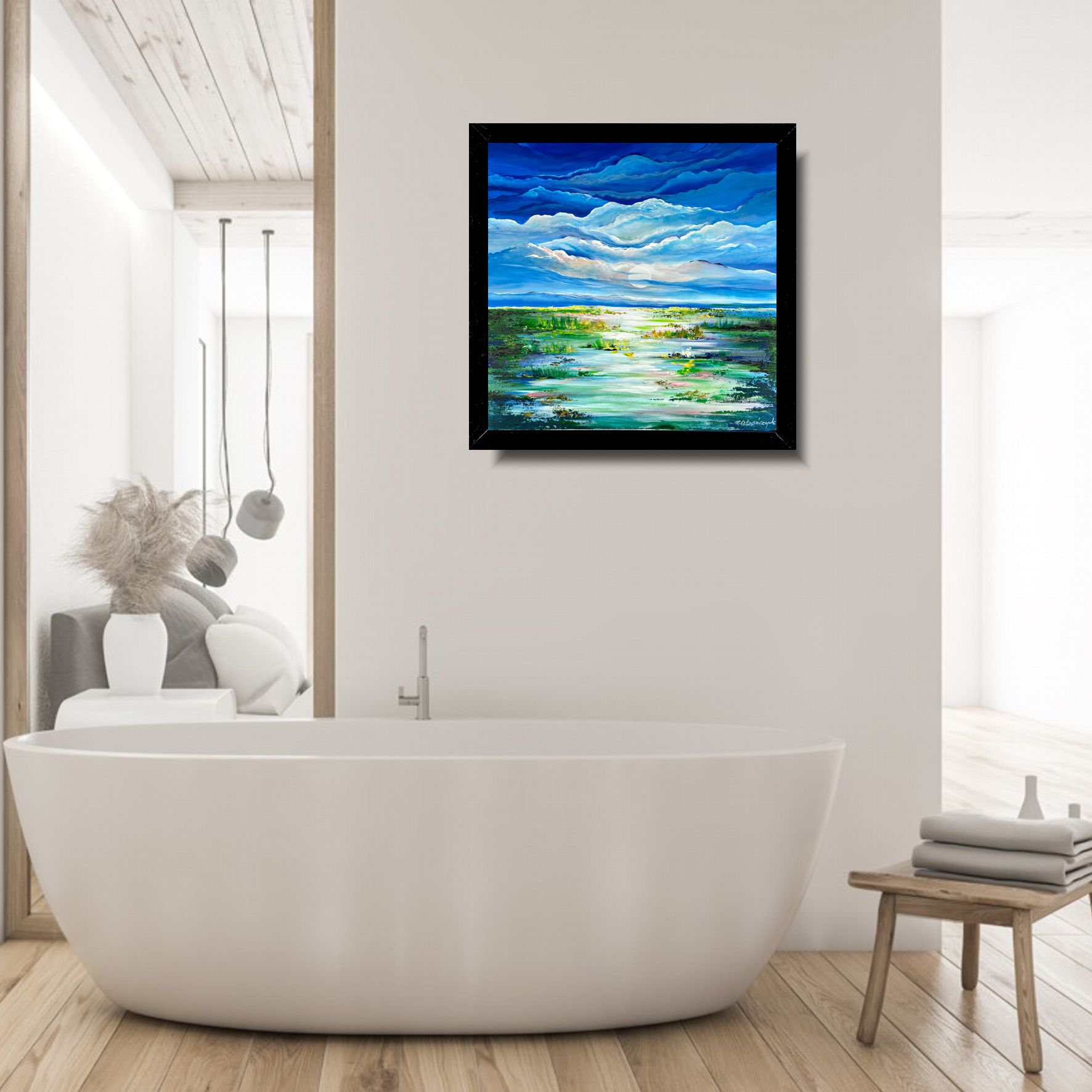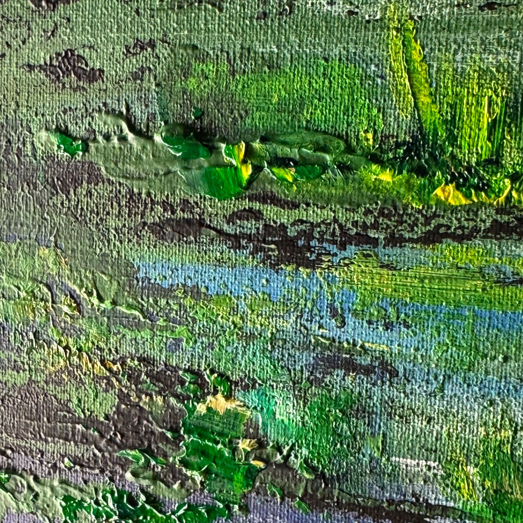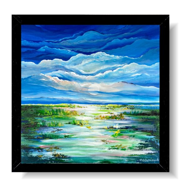 Obraz ręcznie malowany na płótnie „Beztroski dzień nad jeziorem” 2150A to obraz przenoszący nas w sielankowy krajobraz polskiej wsi. Mokre pola symbolizują tutaj nadchodzącą wiosnę. Odrodzenie się przyrody.