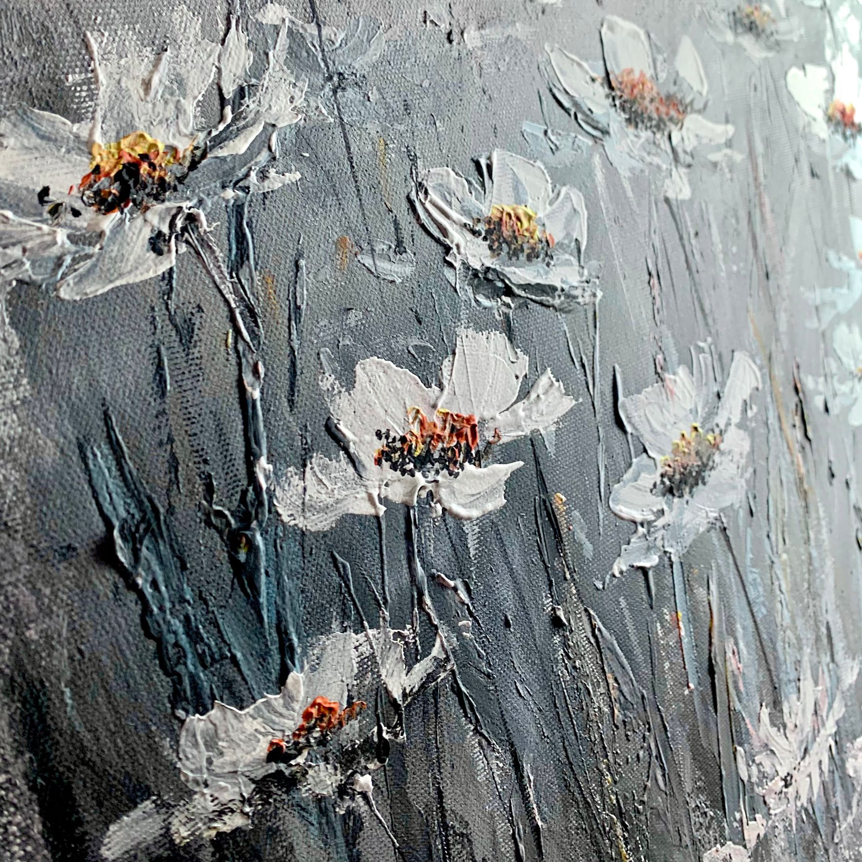 Obraz ręcznie malowany na płótnie „Rumiankowe pole” 2255A. Ten uroczy obraz przenosi nas na malowniczą rumiankową łąkę, gdzie piękne kwiaty układają się w harmonijną całość. Kompozycja oddaje piękno prostoty natury i zachwyca swoją subtelnością. Widzimy szerokie pole, pokryte delikatnymi rumiankami, które niczym białe klejnoty zdobią całą przestrzeń płótna. Każdy kwiat ma swój własny charakter, a jednak razem tworzą malowniczy krajobraz, jak z bajki.