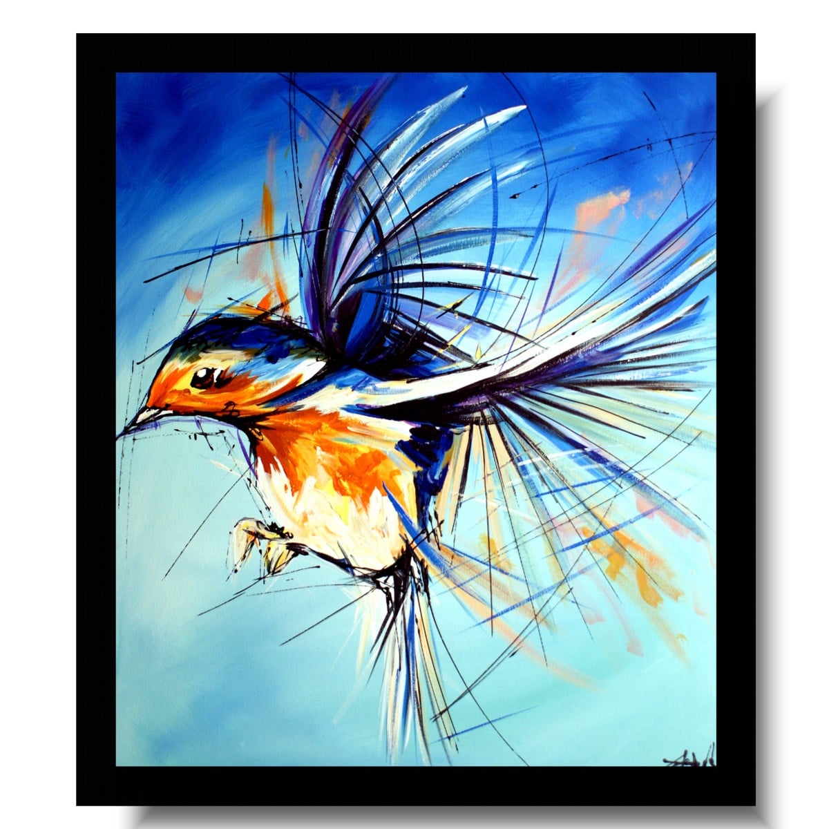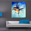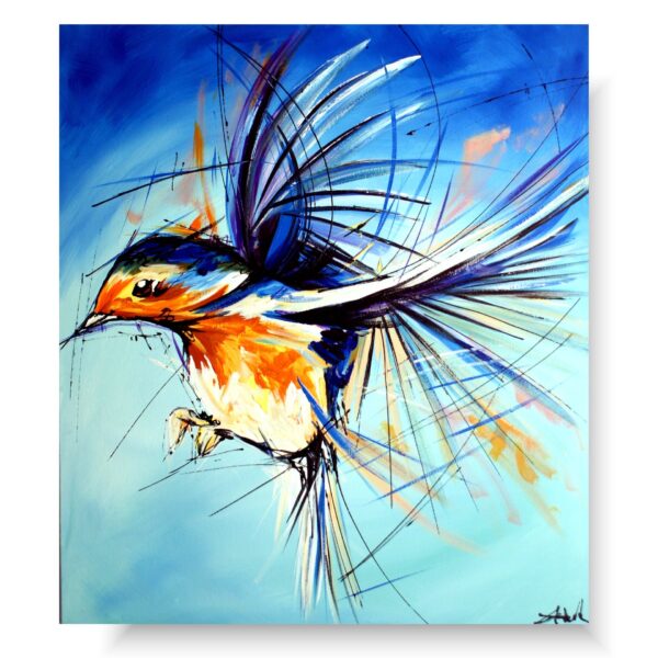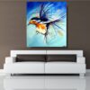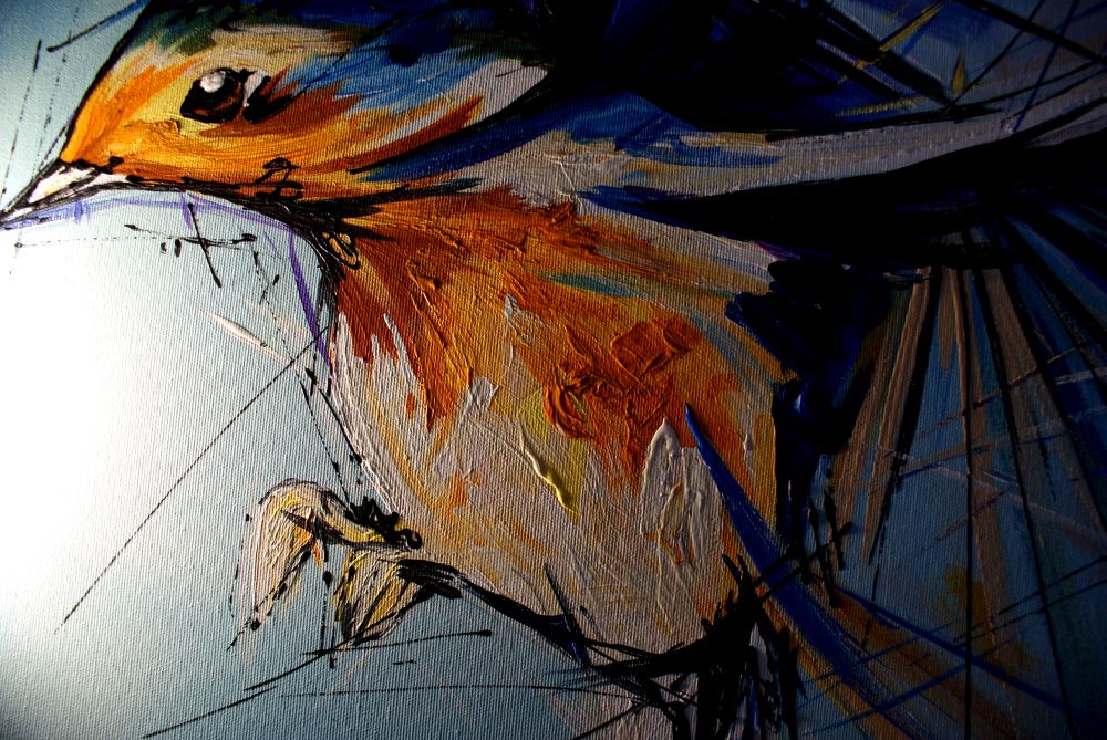 Obraz zwierzęta ptaszek wróbel na wietrze w ciekawej kolorystyce. Modny obraz jest niekonwencjonalny pod względem formalnym jaki i warsztatowym. Do namalowania tego obrazu użyto całej palety barw, co daje efekt nowoczesnego designu. Obraz może ożywić modne jednobarwne wnętrze – salon, biuro, korytarz, restaurację, pub. Możemy namalować – obrazy z motylami, obrazy z końmi, obrazy z zebrami.