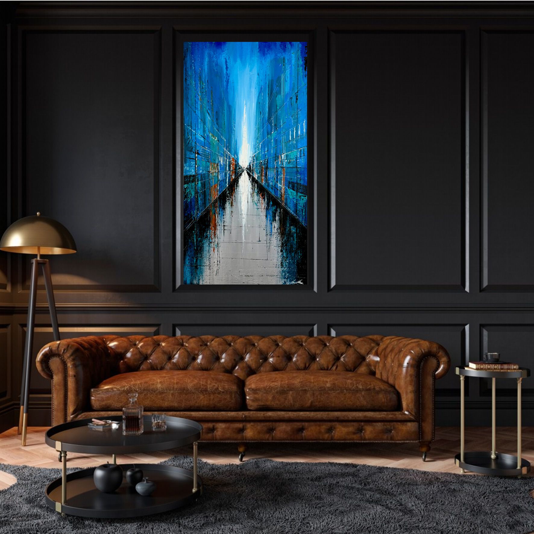 Obrazy na ścianę architektura „Męski spacer” w zdecydowanej ciemnej kolorystyce idealnie pasujące do nowoczesnego wnętrza. Można powiesić go w biurze, salonie czy przedpokoju. Obraz malowany farbami na płótnie z zastosowaniem najnowszych mas plastycznych oddających fakturę i głębię obrazu. Kolekcje i wzory naszych obrazów wyróżniają się oryginalnością, są w modnych kolorach i pasują zarówno do wnętrz klasycznych – salon, sypialnia, biuro, jak i do nowoczesnych aranżacji – sklep, restauracja, pub. Obrazy na płótnie ręcznie malowane to idealny prezent dla mamy, babci, na wesele lub urodziny.