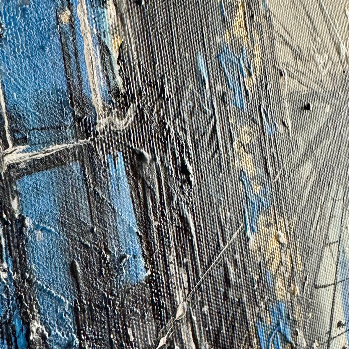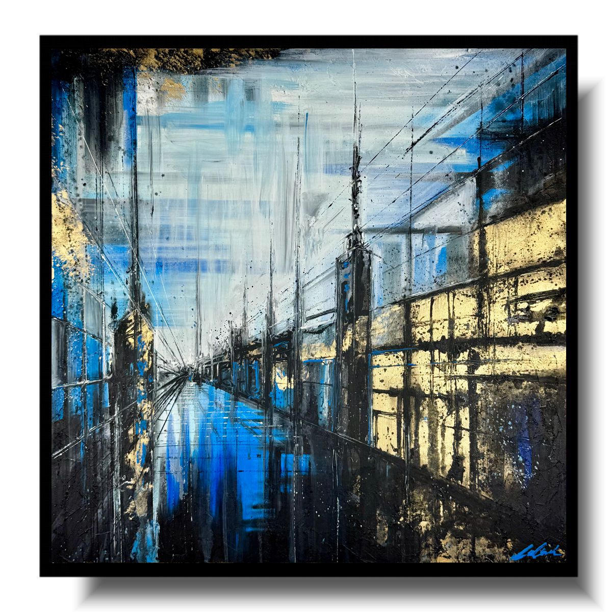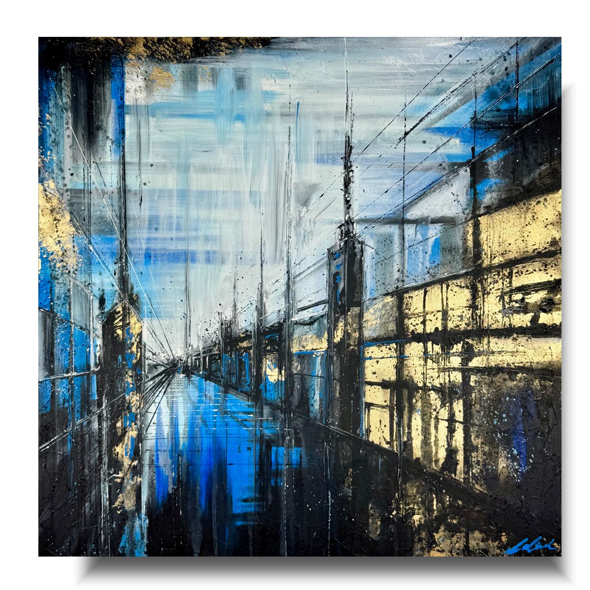 Kolorystyka obrazu: niebieski, błękitny, złoty, biały, czarny, szary,