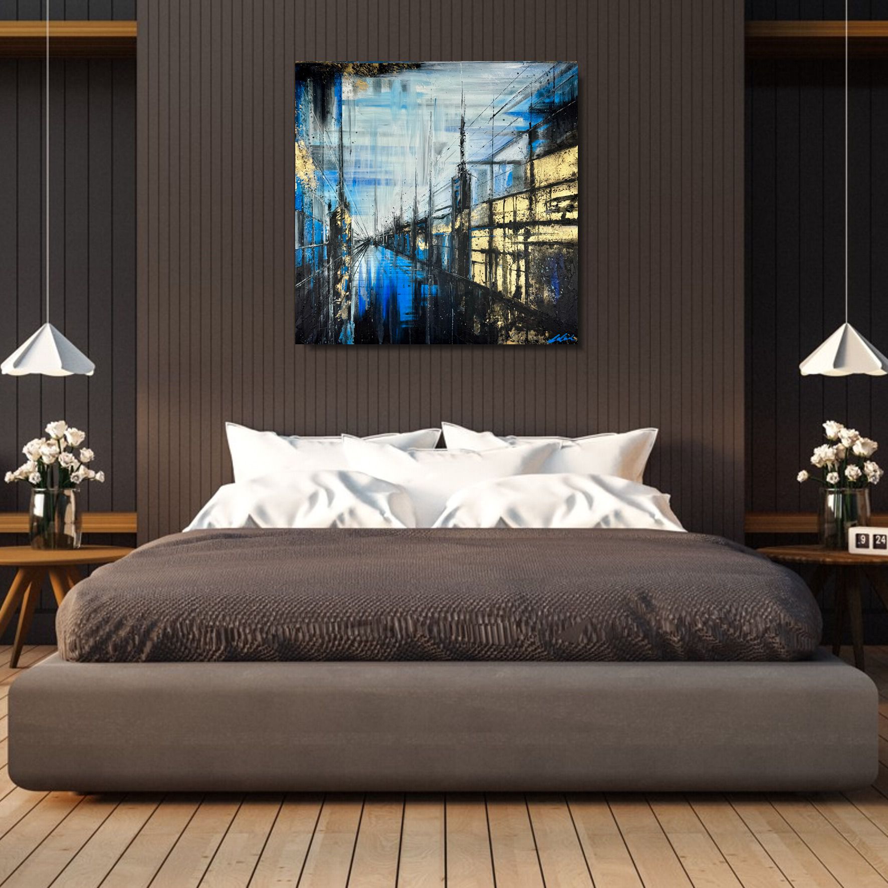 Obrazy ręcznie malowany na płótnie „Nocne miasto” 1899A obraz przestawiony w graficznej formie i bardzo ograniczonej gamie kolorystycznej. Dzięki użyciu różnych narzędzi do nakładania farby obraz zyskuje trójwymiarowości i głębi. Użyte dodatkowo złoto w budowaniu brył budynków tworzy odpowiednio różne kształty i oddziela od siebie poszczególne elementy kompozycji. Obrazy miasta wyróżniają się oryginalnością, nawiązują do klasycznych wzorców i najnowszych trendów – kolory wybieramy z najmodniejszej palety barw, wzory inspirowane są nowościami w designie. Zapraszamy do sprawdzenia innych kategorii: obrazy do biura, obrazy do salonu, obrazy do sypialni, obrazy abstrakcje, obrazy kwiaty. Jeśli nie znajdą Państwo niczego interesującego malujemy także obrazy na zamówienie w pełni dostosowane do Państwa wymagań.