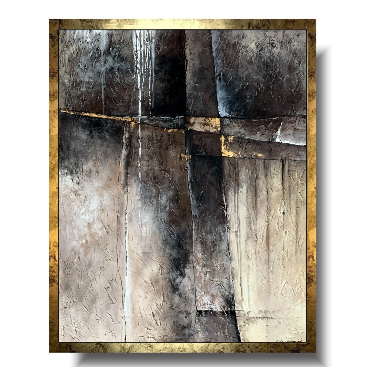 Kolorystyka obrazu: brązowy, wenge, beżowy, złoty, szary, biały, czarny + złota przecierana rama (listwa szerokości 4cm i grubości 2,5cm)