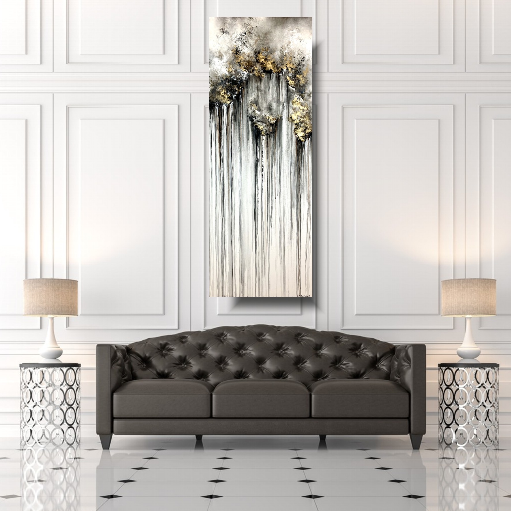 Obraz ręcznie malowany na płótnie „Genialne myśli” 2247A. Pionowy obraz abstrakcyjny przenosi nas w krainę spokoju i delikatności, gdzie beżowo złote chmury wydają się unosić w powietrzu. Kompozycja oddaje subtelność i spokojny ruch, tworząc wizualny spokój. Na płótnie widzimy warstwy odcieni beżu i szarości, które splatają się i unoszą, tworząc efekt chmur w ruchu. Ich lekkość muśnięta złotem uwidacznia niewyraźne granice wprowadzając do przestrzeni obrazu uczucie mgły i niematerialności. Światło, które tworzy się na obrazie poprzez użycie grubej faktury farby dodaje głębi i cienia, tworząc trójwymiarowy efekt, który wprowadza odbiorcę w bezpośredni wręcz namacalny kontakt z dziełem.