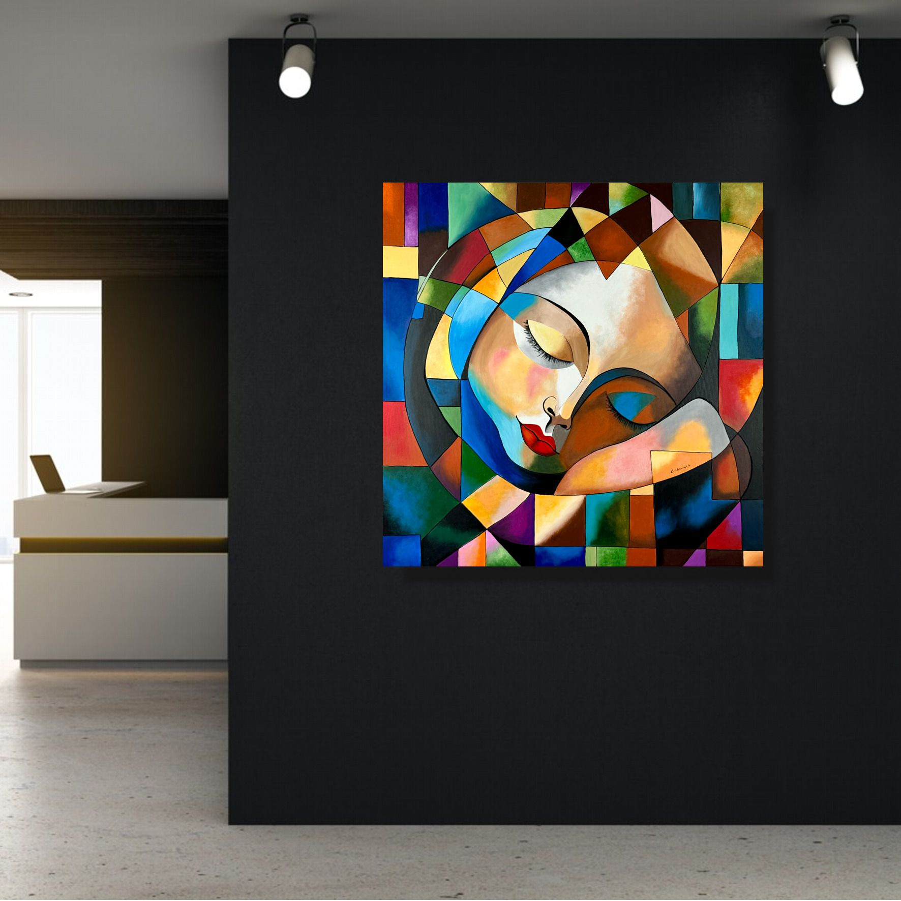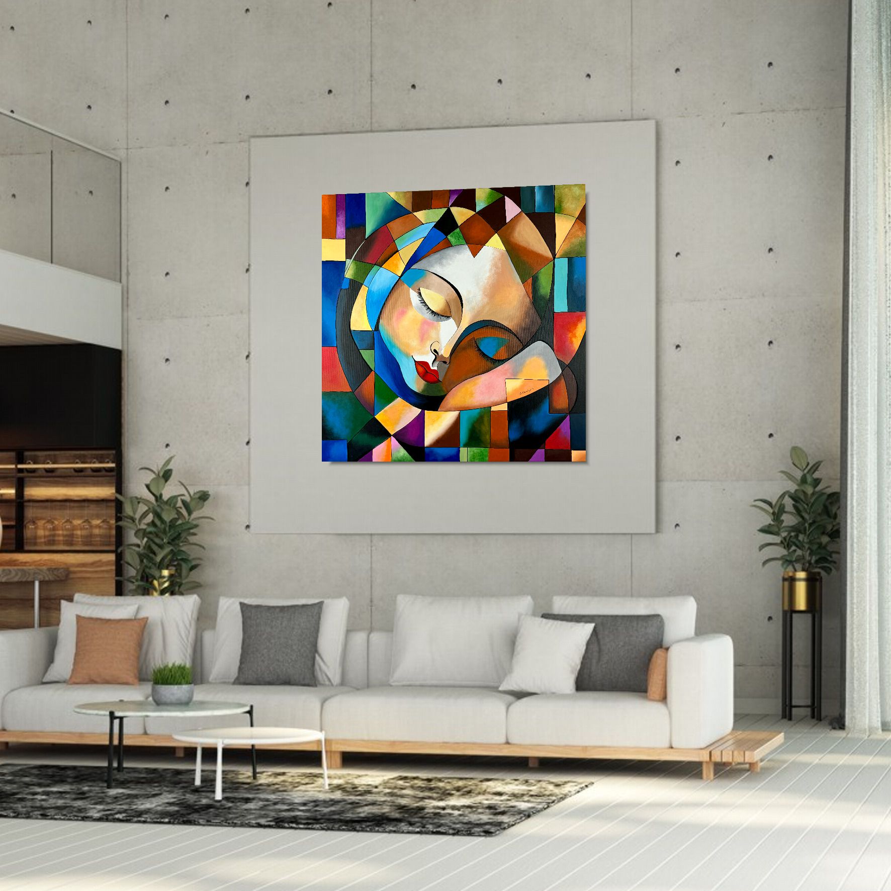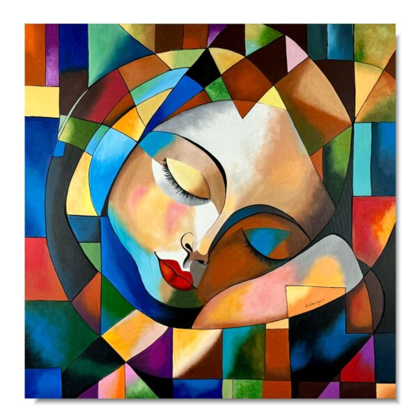 Portret ręcznie malowany kubizm „Uśpione piękno” 2316A wyraża spokój śpiącej kobiety, ale również jej piękno. Obraz wielobarwny, ale kolory idealnie ze sobą współgrają, nie są drażniące. Nasze obrazy mogą dopełnić Twoje wnętrze i stać się ozdobą salonu, sypialni czy biura.