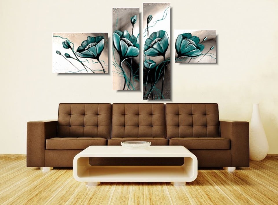 Turkusowe kwiaty obraz – z kwiatami jest niekonwencjonalny pod względem formalnym jaki i warsztatowym. Do namalowania tego nowoczesnego obrazu użyto modnej palety barw, co daje efekt nowoczesnego designu. Obraz współczesny może ożywić modne jednobarwne wnętrze – salon, biuro, korytarz, restaurację, pub. Możemy namalować duże kolorowe abstrakcje, modne obrazy z kwiatami, obrazy sakralne, ponadczasowe obrazy z aniołami, portrety ze zdjęcia.