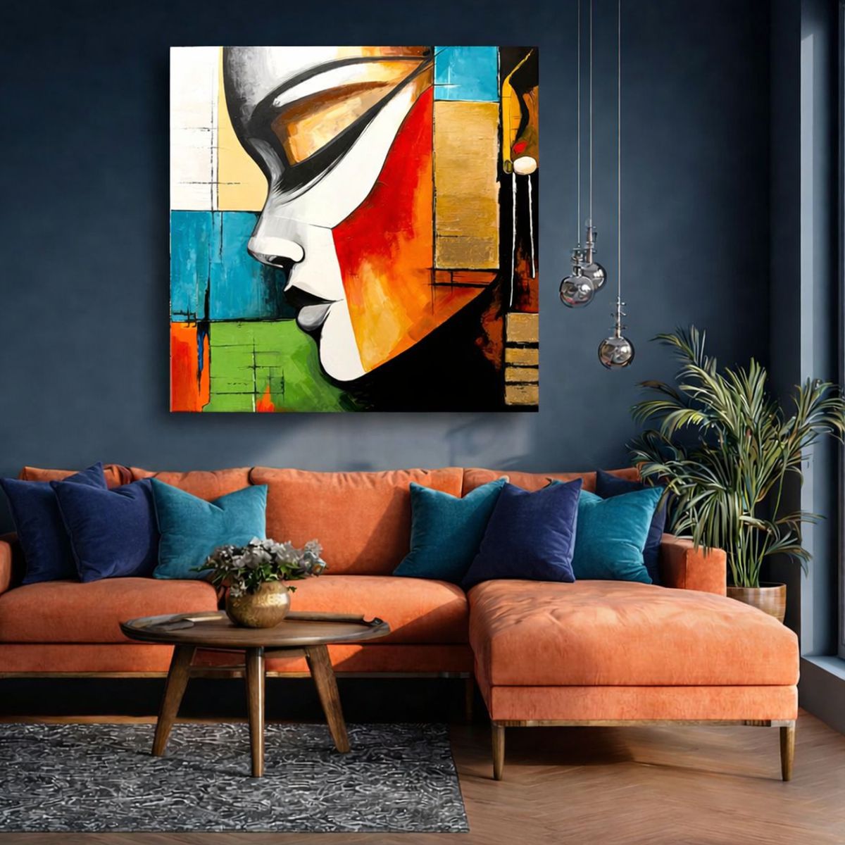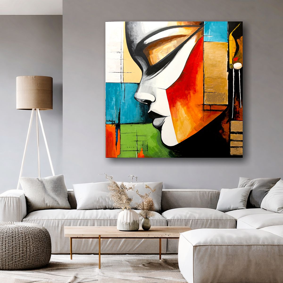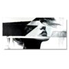 Ten nowoczesny obraz portretowy łączy figuratywną formę z abstrakcyjną geometrią. Złote akcenty prowadzą wzrok i nadają kompozycji elegancji.