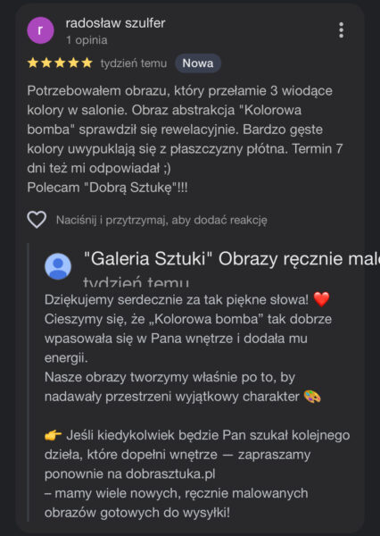 „Potrzebowałem obrazu, który przełamie 3 wiodące kolory w salonie. Obraz abstrakcja ‘Kolorowa bomba’ sprawdził się rewelacyjnie. Bardzo gęste kolory uwypuklają się z płaszczyzny płótna. Termin 7 dni też mi odpowiadał 😉 Polecam ‘Dobrą Sztukę’!!!”