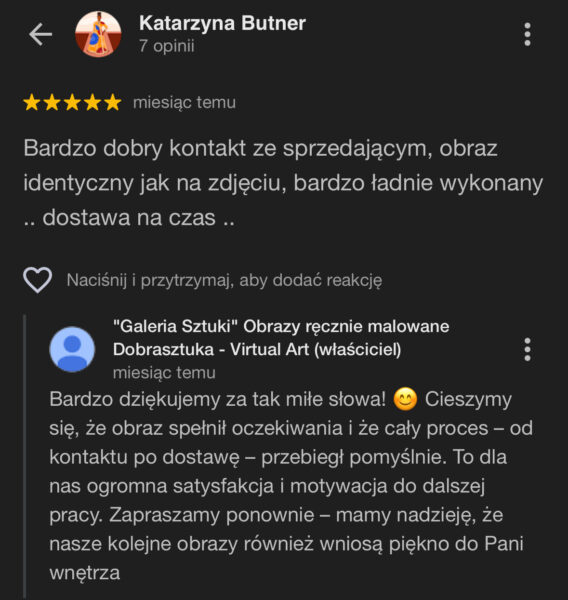 „Przepiękne, ręcznie malowane obrazy, tworzone z dbałością o każdy szczegół. W ciągu 2 lat zakupiliśmy od Państwa 3 obrazy i w każdym z nich jakość oraz kompozycja tworzone przez p. Urbańczyk zwracają uwagę🙂 Polecamy!”