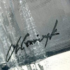 Warstwowa faktura farby nadaje powierzchni głębi. Kontrast czerni i bieli sprawia, że obraz reaguje na oświetlenie i zmienia charakter w zależności od wnętrza.