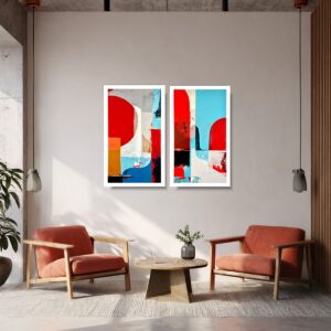 Obraz dyptyk abstrakcja to nowoczesna kompozycja geometryczna zbudowana z minimalistycznych form i kontrastów kolorystycznych. Dwie części tworzą spójną całość, która buduje rytm i równowagę we wnętrzu.