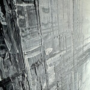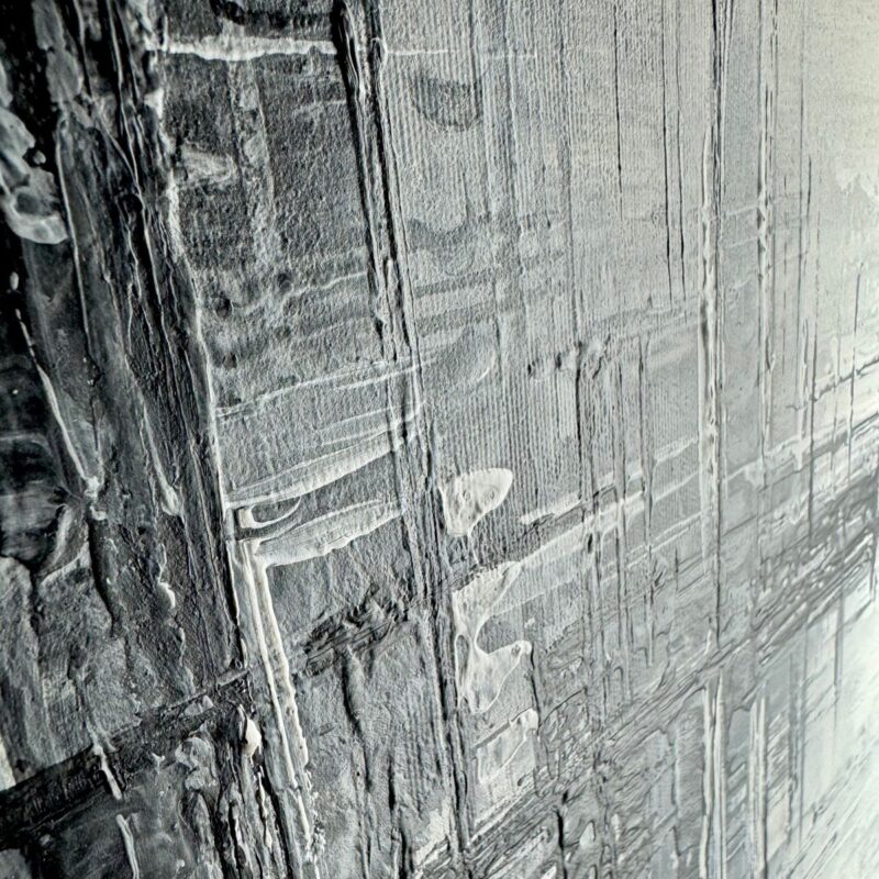 Obraz pionowy na korytarz “Zapomniany świat” abstrakcja 2204A wyróżnia się mglistym spojrzeniem na architekturę. To piękny delikatny obraz w odcieniach szarości z czarnym passe partout imitującym rame
