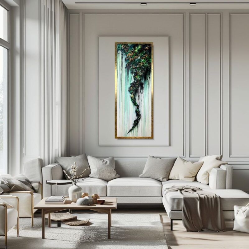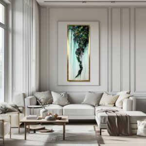 Obraz ręcznie malowany na płótnie “Złote urwisko” – zakrzywiona forma nierealnej abstrakcji obsadzona w malarskiej materii. Jej przekaz ze swoistą wypukłością formy to uproszczenie wizualnego zamysłu artysty w wielkoformatowym wydaniu. Obraz ręcznie malowany na płótnie “Złote urwisko” jest niekonwencjonalny pod względem formalnym jaki i warsztatowym. Duży pionowy obraz w pięknej stonowanej kolorystce z refleksami złota cieszy oczy. Abstrakcja to nasza specjalność dlatego inne klasyczne formy malarstwa staramy się przestawić w abstrakcyjny sposób. Obraz w dużym formacie, nowoczesne obrazy do salonu, modne obrazy do biura, eleganckie obrazy do mieszkania mogą ożywić każde wnętrze – dom, firmę, mieszkanie.